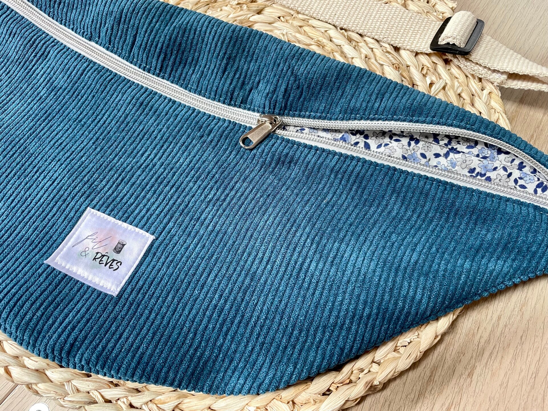 Cette banane XL a été cousu en velours côtelé avec une doublure 100% coton à motifs.