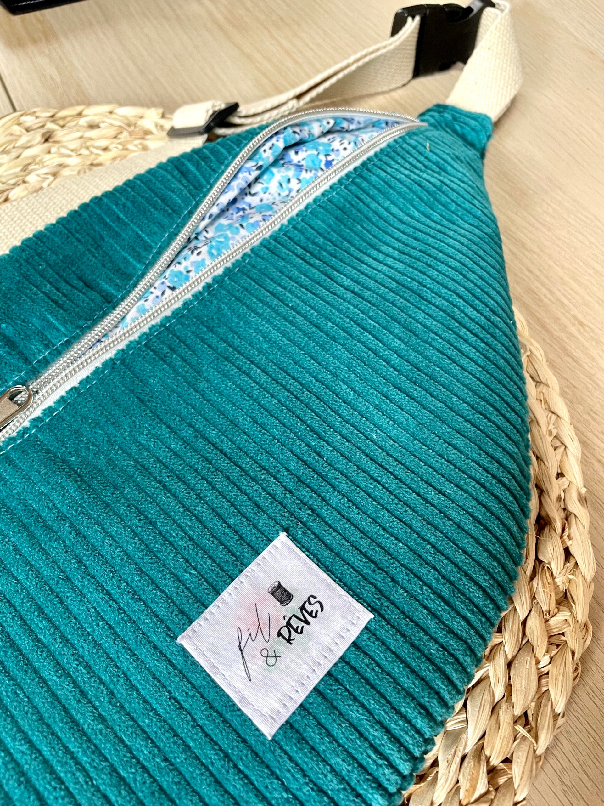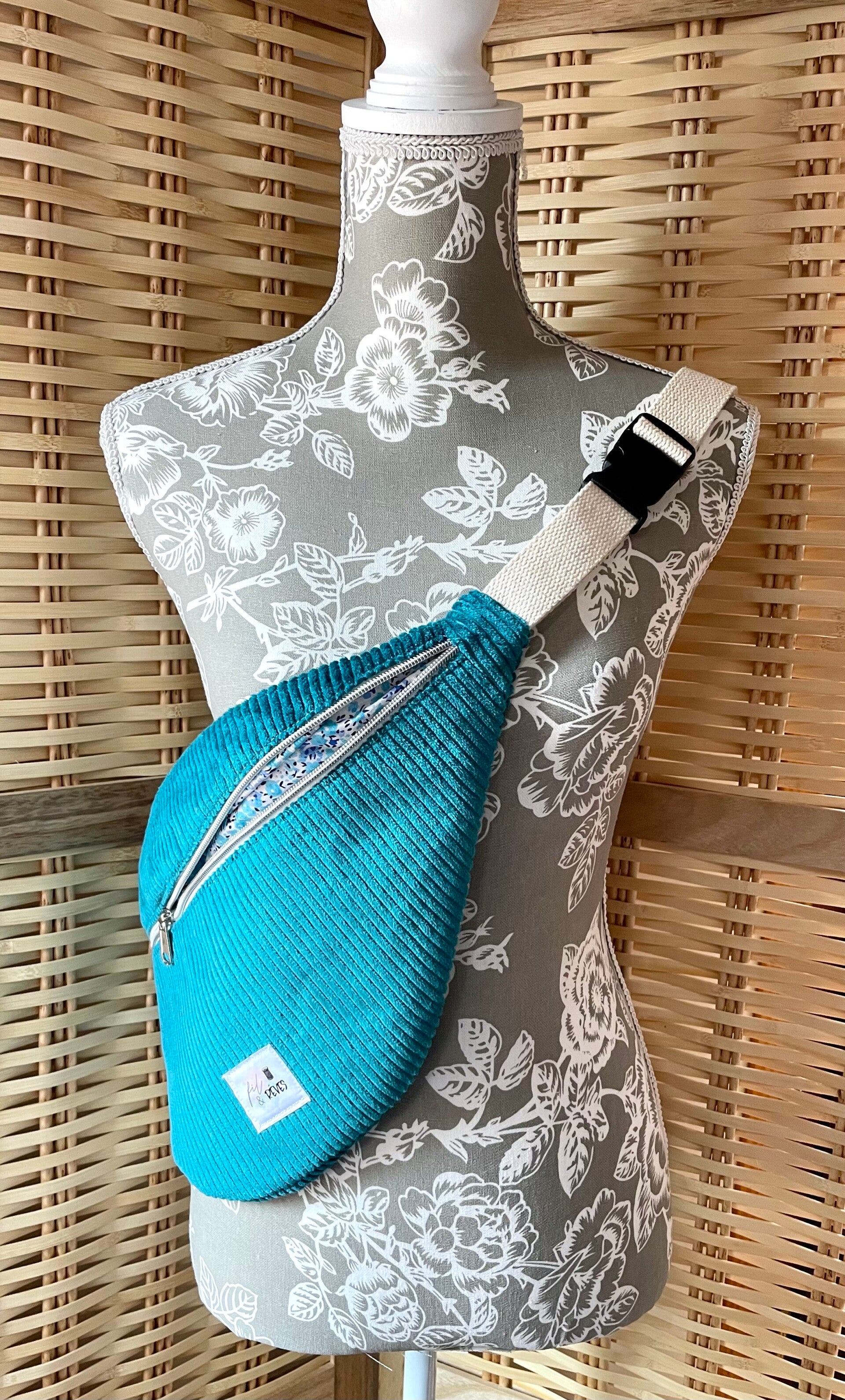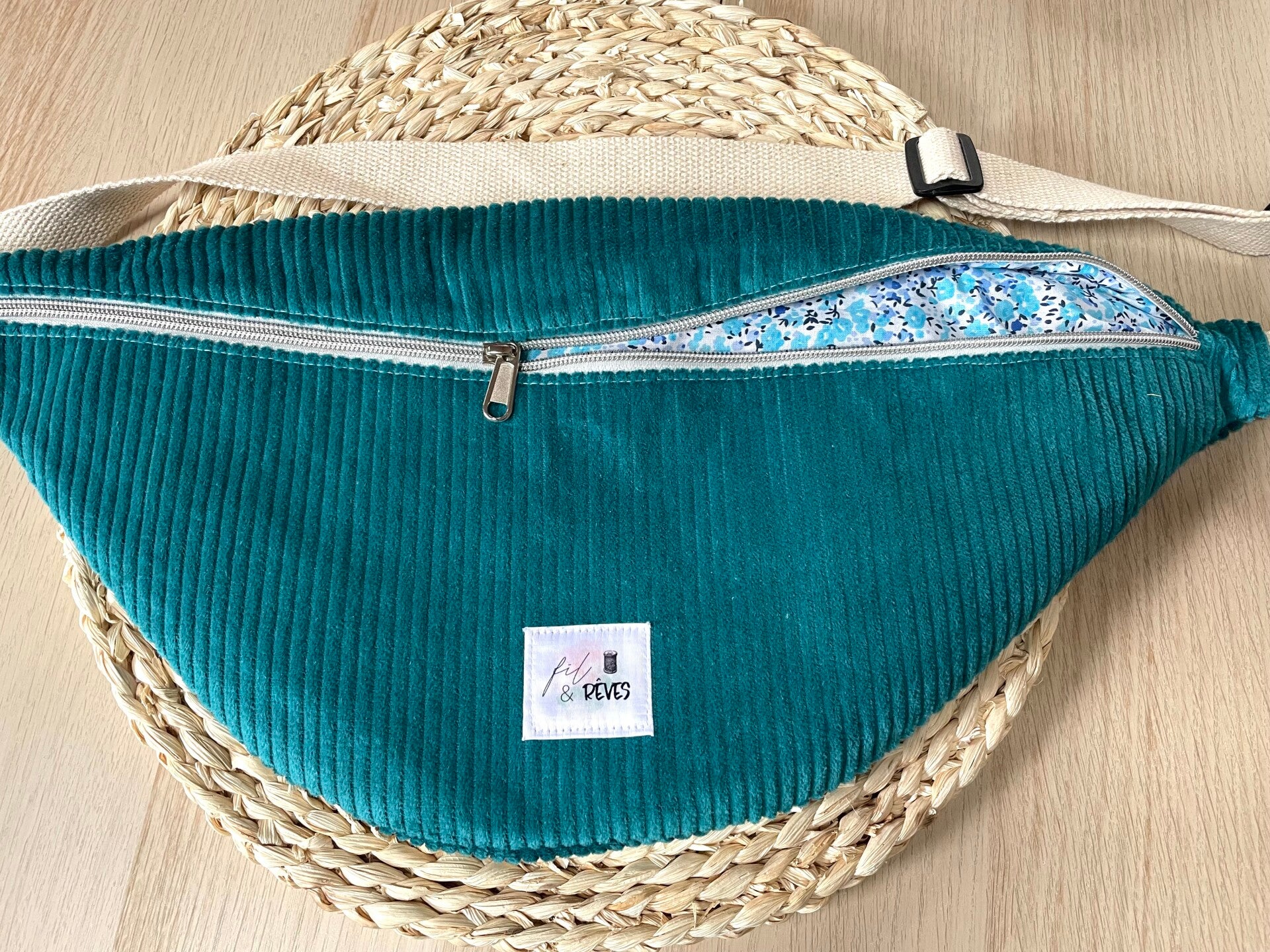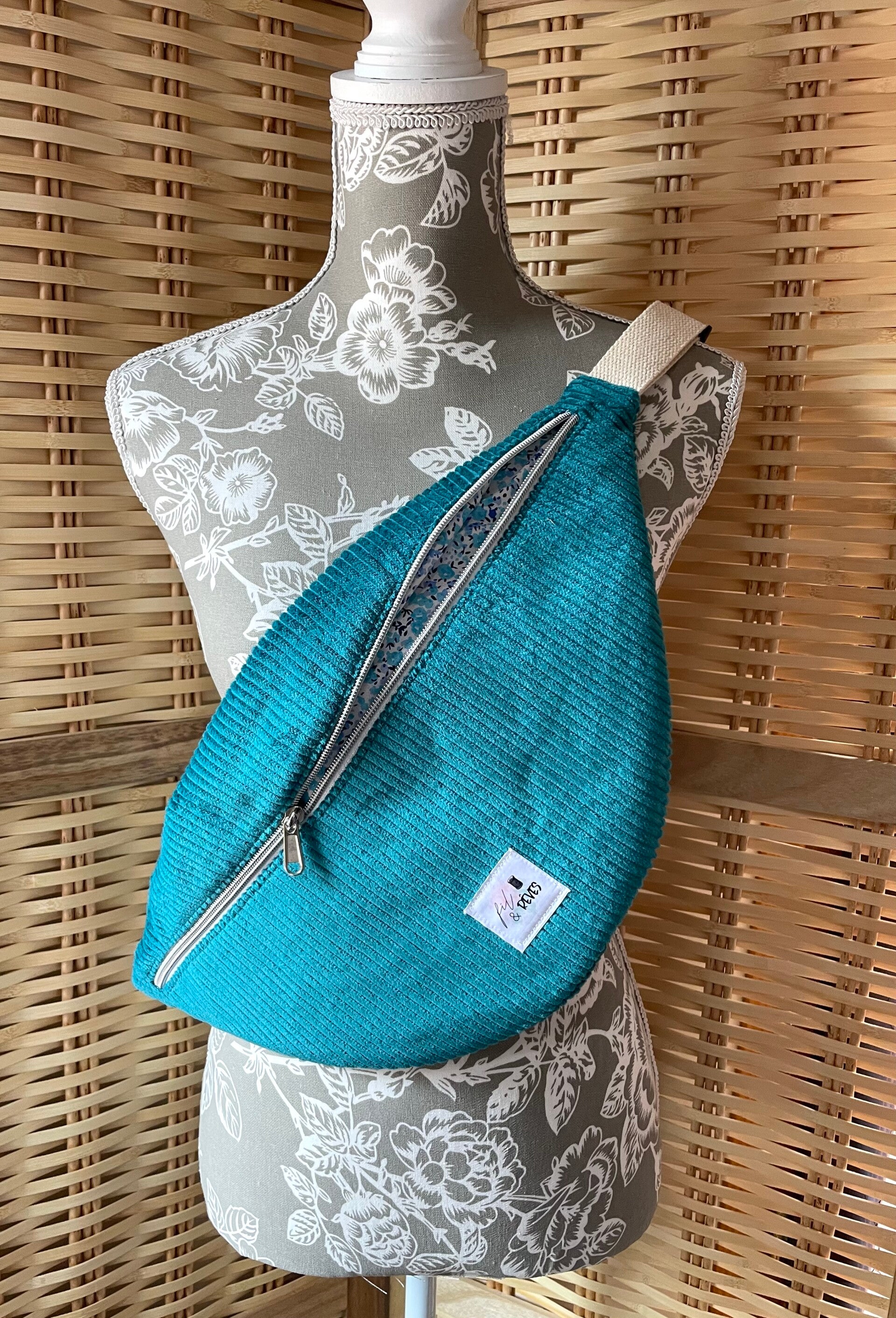 Cette banane XL a été cousu en velours côtelé avec une doublure 100% coton à motifs.