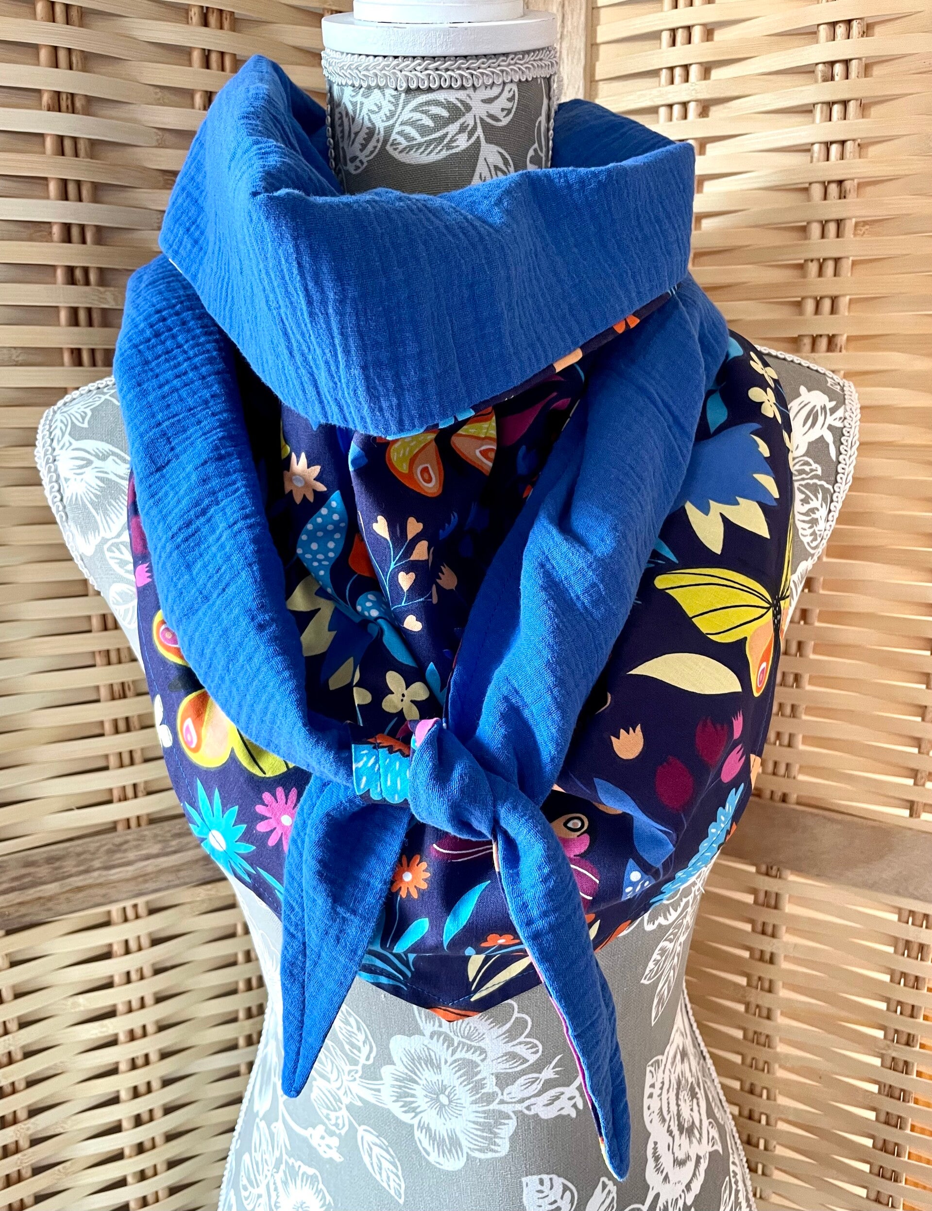 Chèche léger et idéal à porter en toutes saisons! Il est en forme triangle et peut se porter des deux côtés selon l’effet souhaité: plus coloré ou plus simple du côté uni.