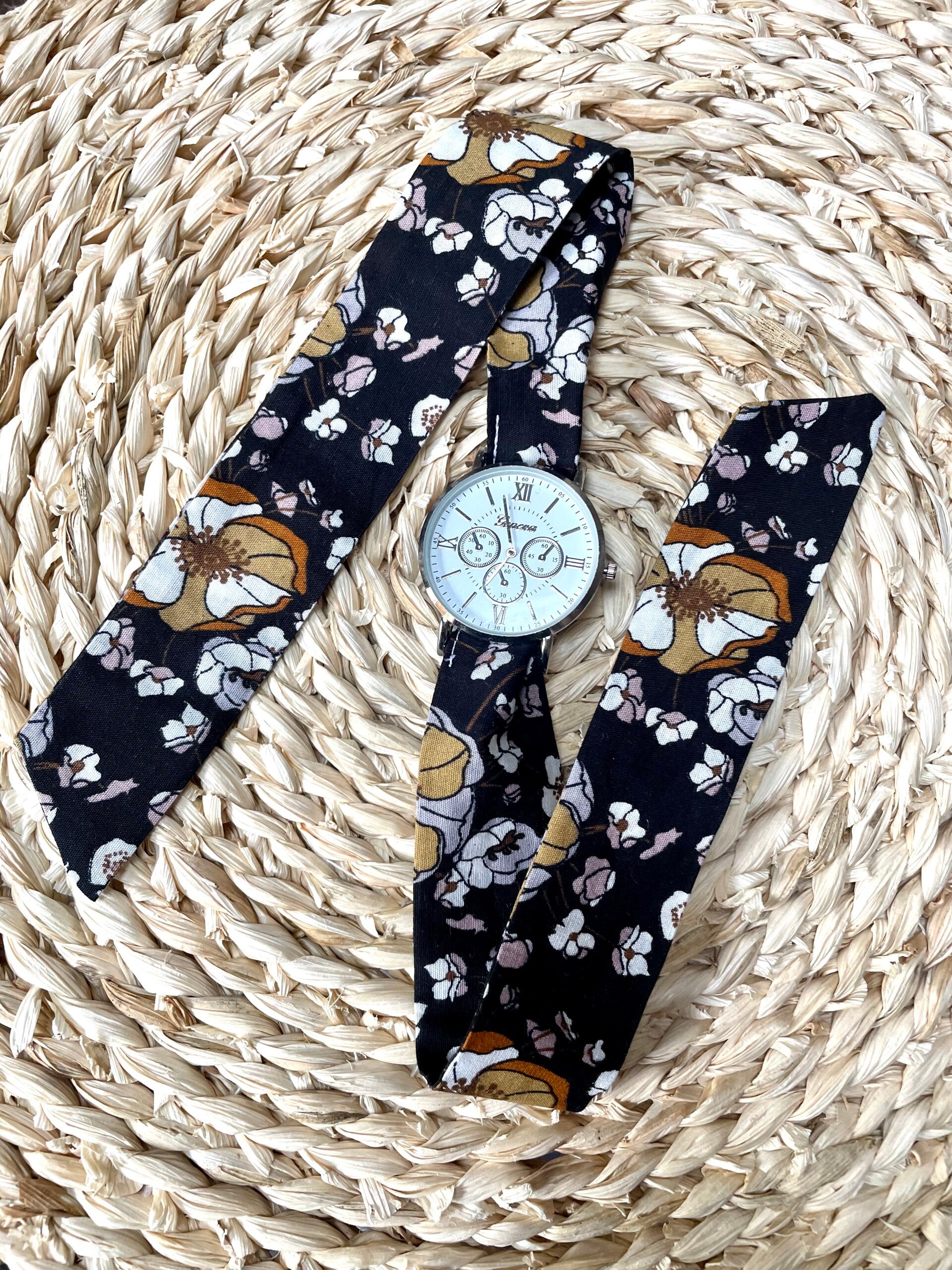 Montre à nouer avec bracelet personnalisable grâce aux nombreux tissus présents dans le catalogue.