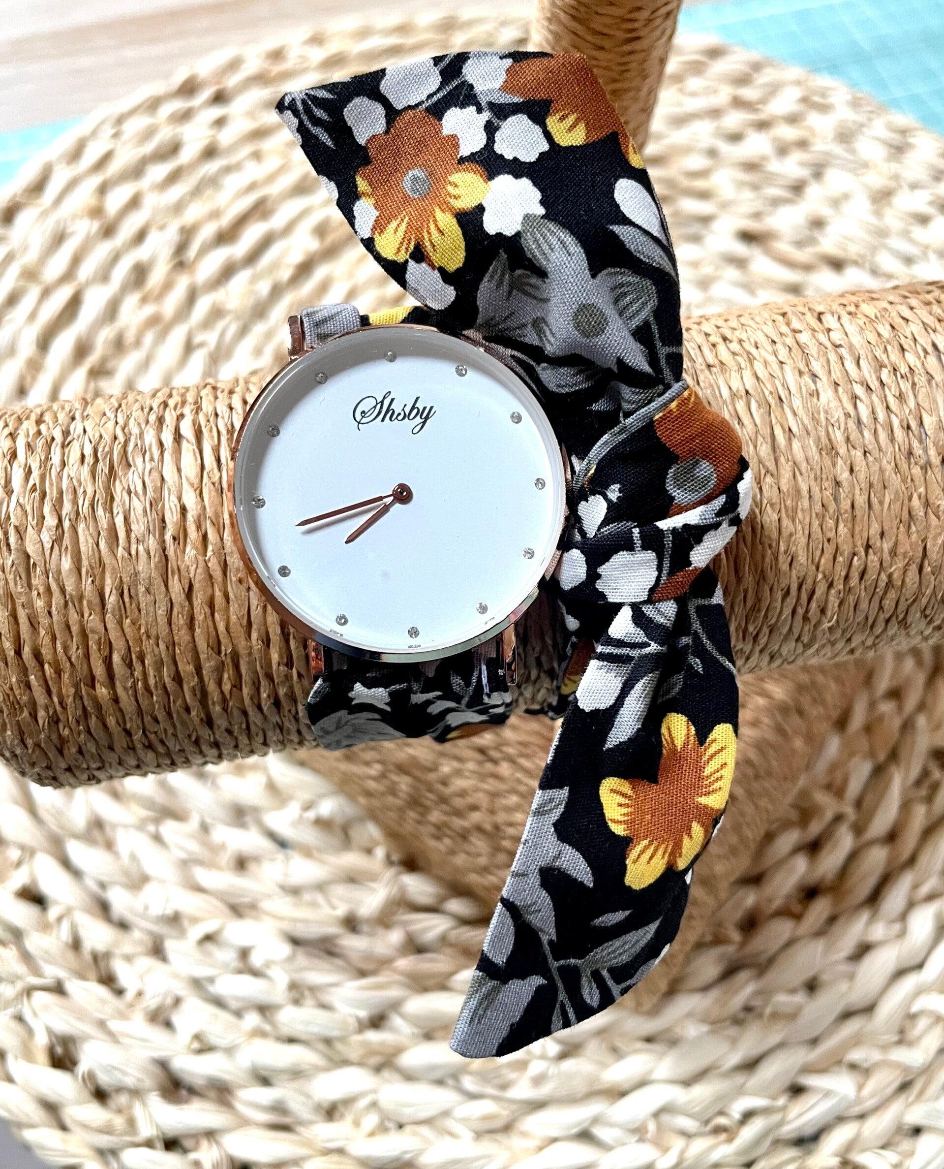Montre à nouer avec bracelet personnalisable grâce aux nombreux tissus présents dans le catalogue.