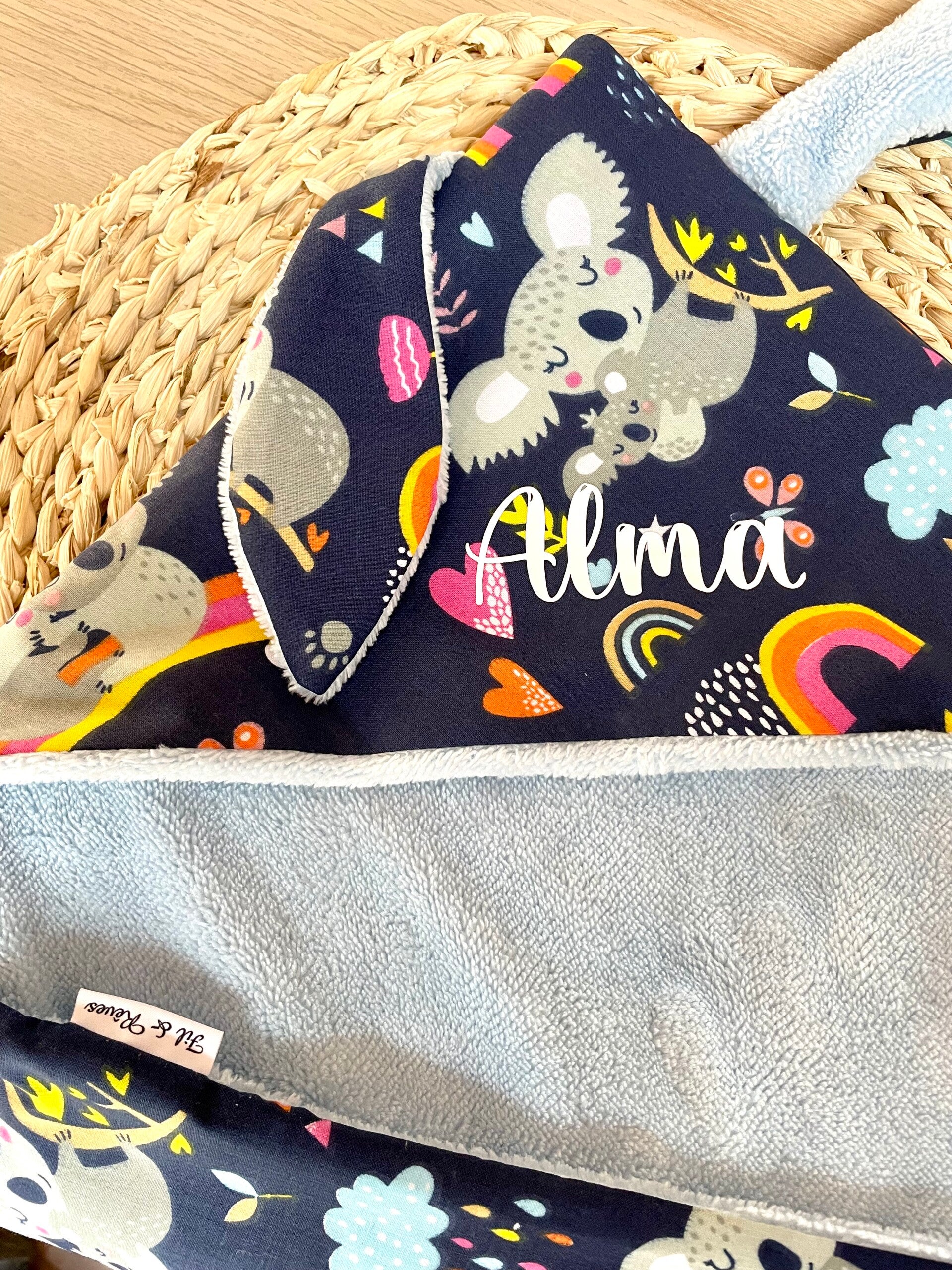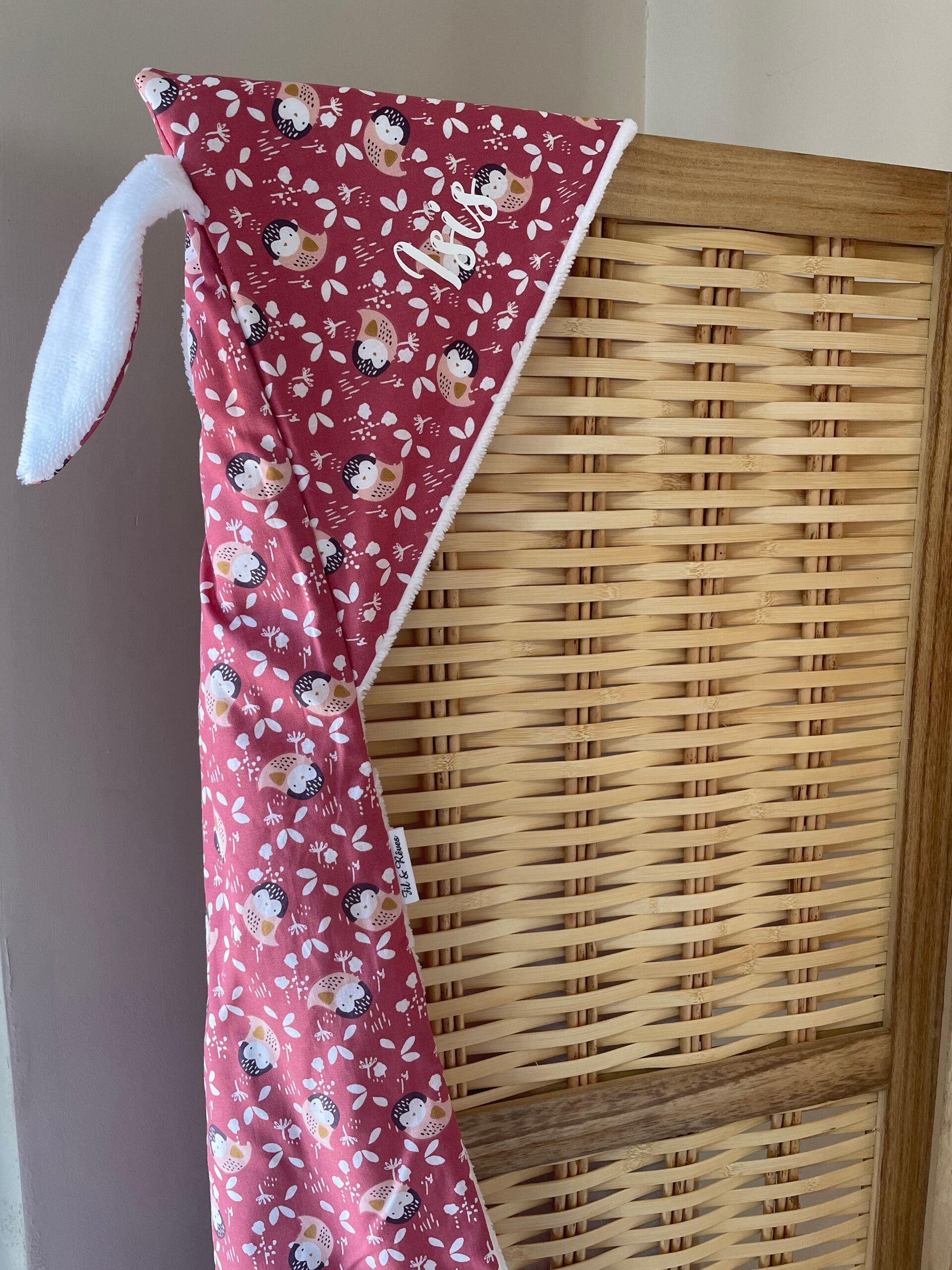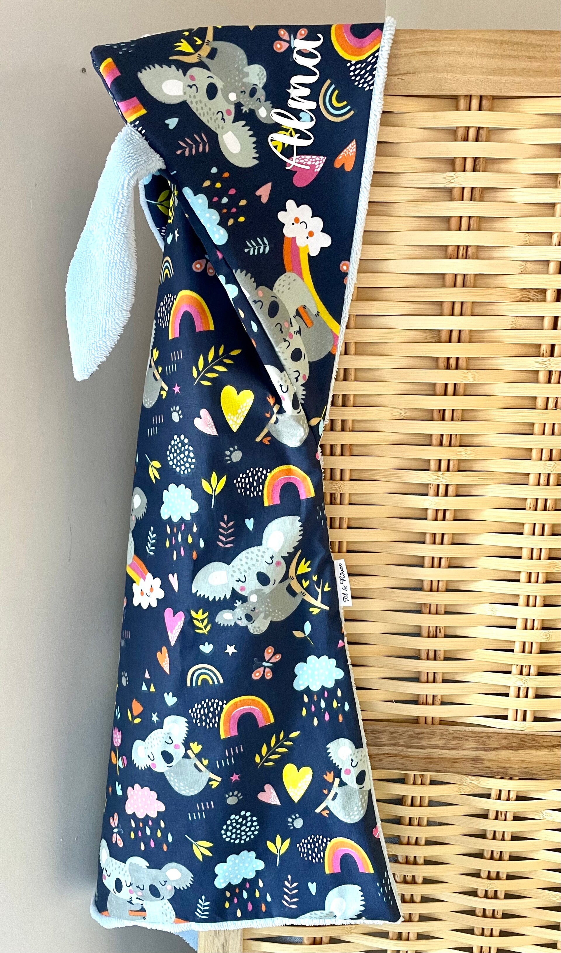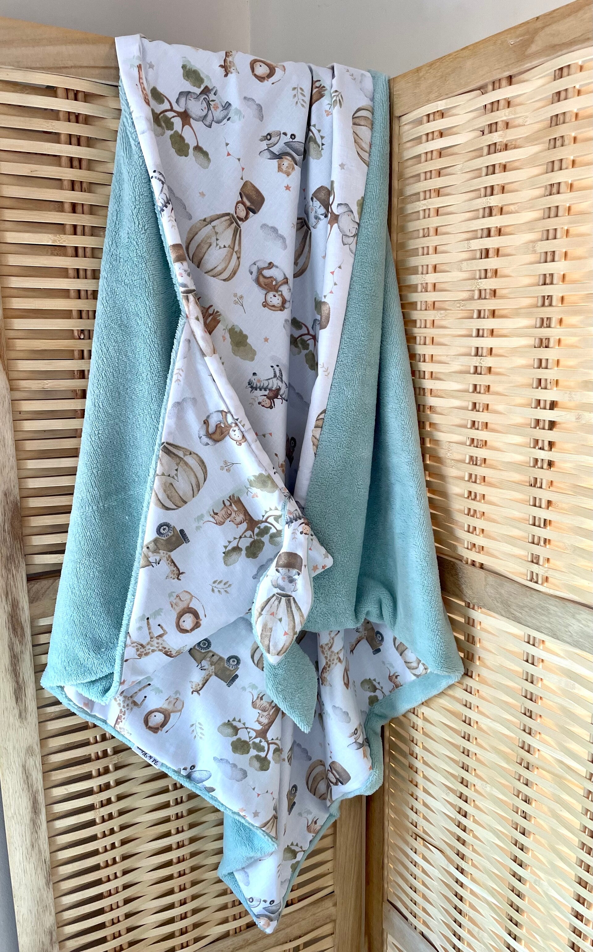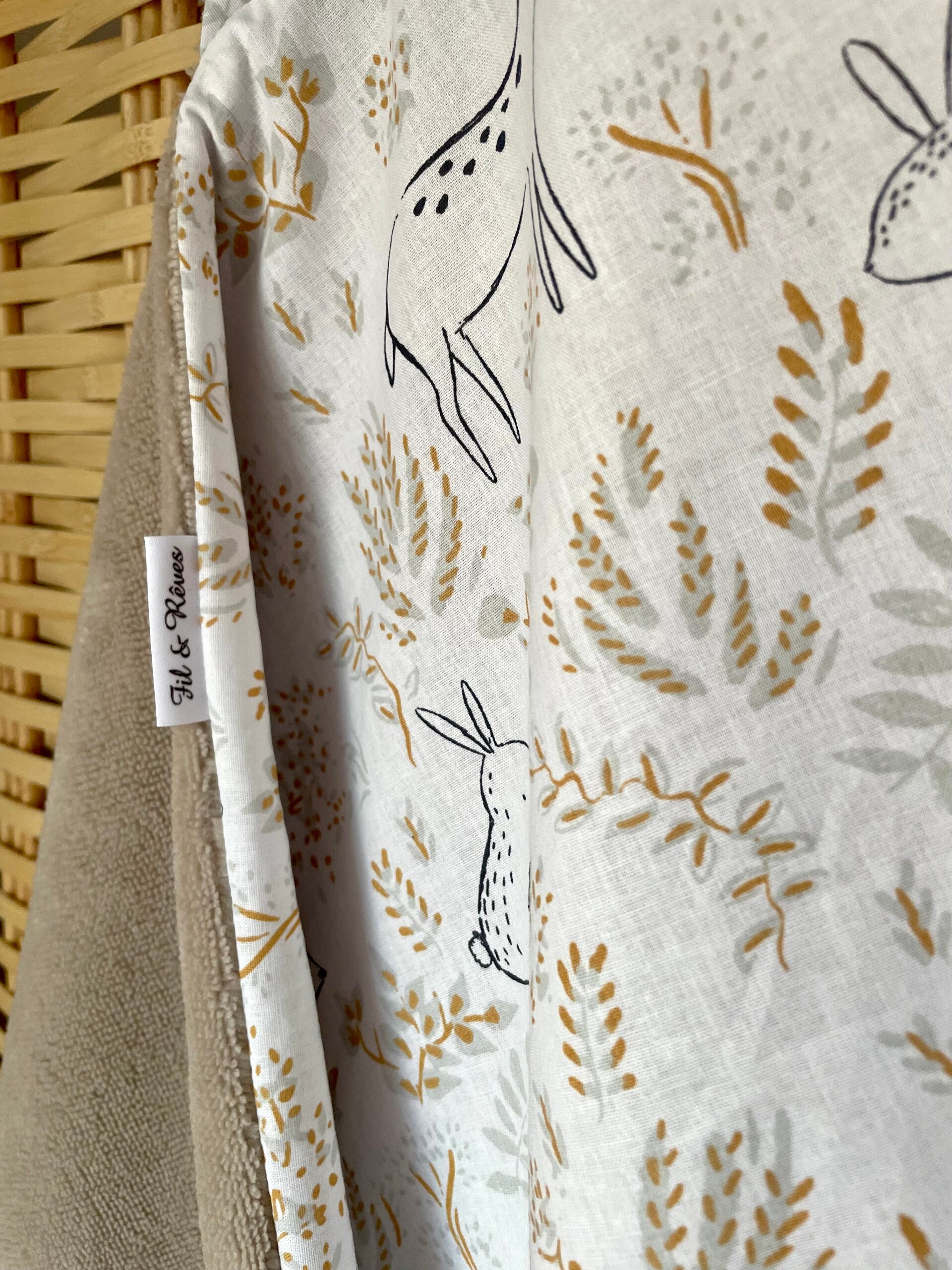 Cape de bain entièremet doublée. Tissu imprimé en coton et côté éponge en bambou très douce certifié Oeko-tex.