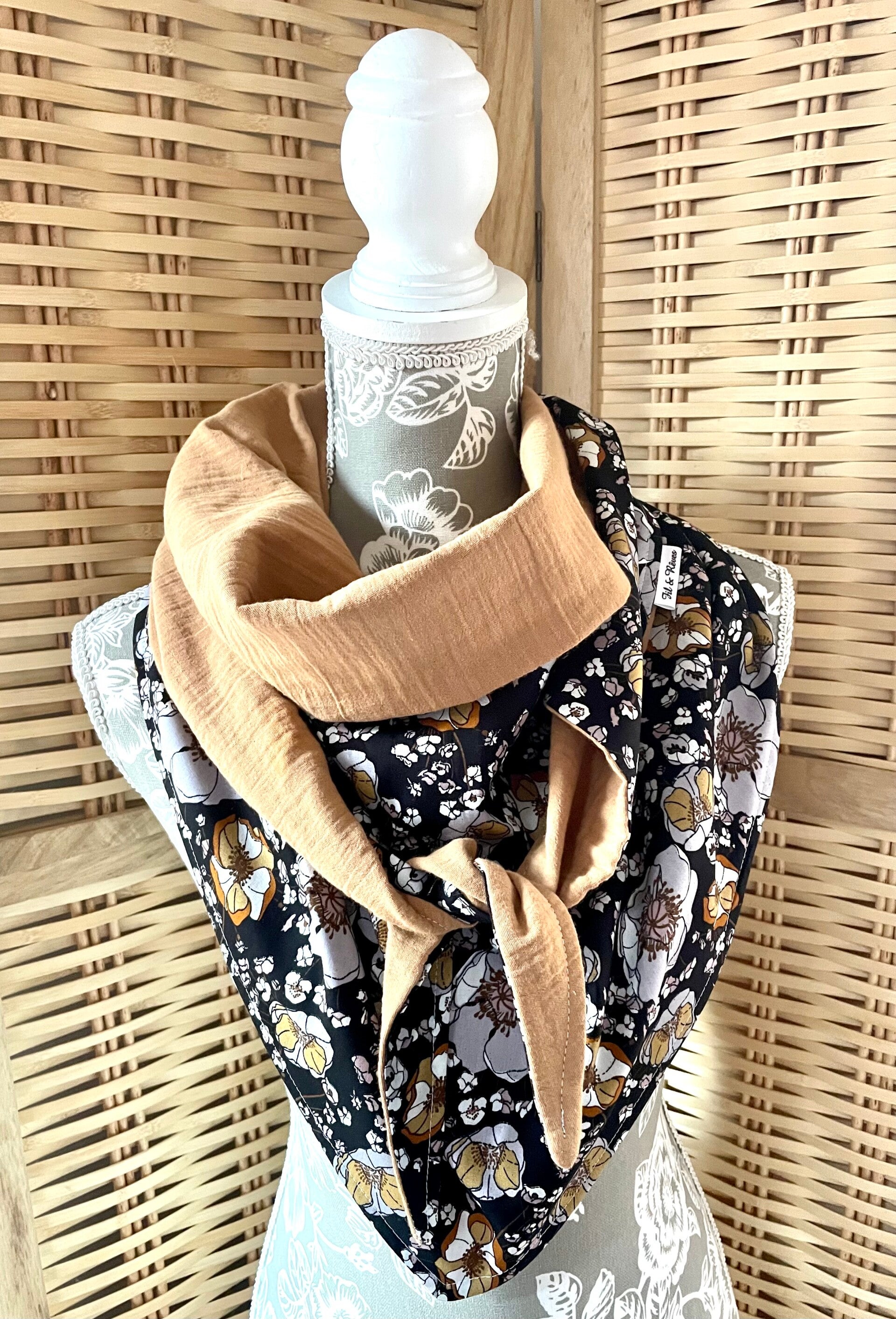 Chèche léger et idéal à porter en toutes saisons! Il est en forme triangle et peut se porter des deux côtés selon l’effet souhaité: plus coloré ou plus simple du côté uni.