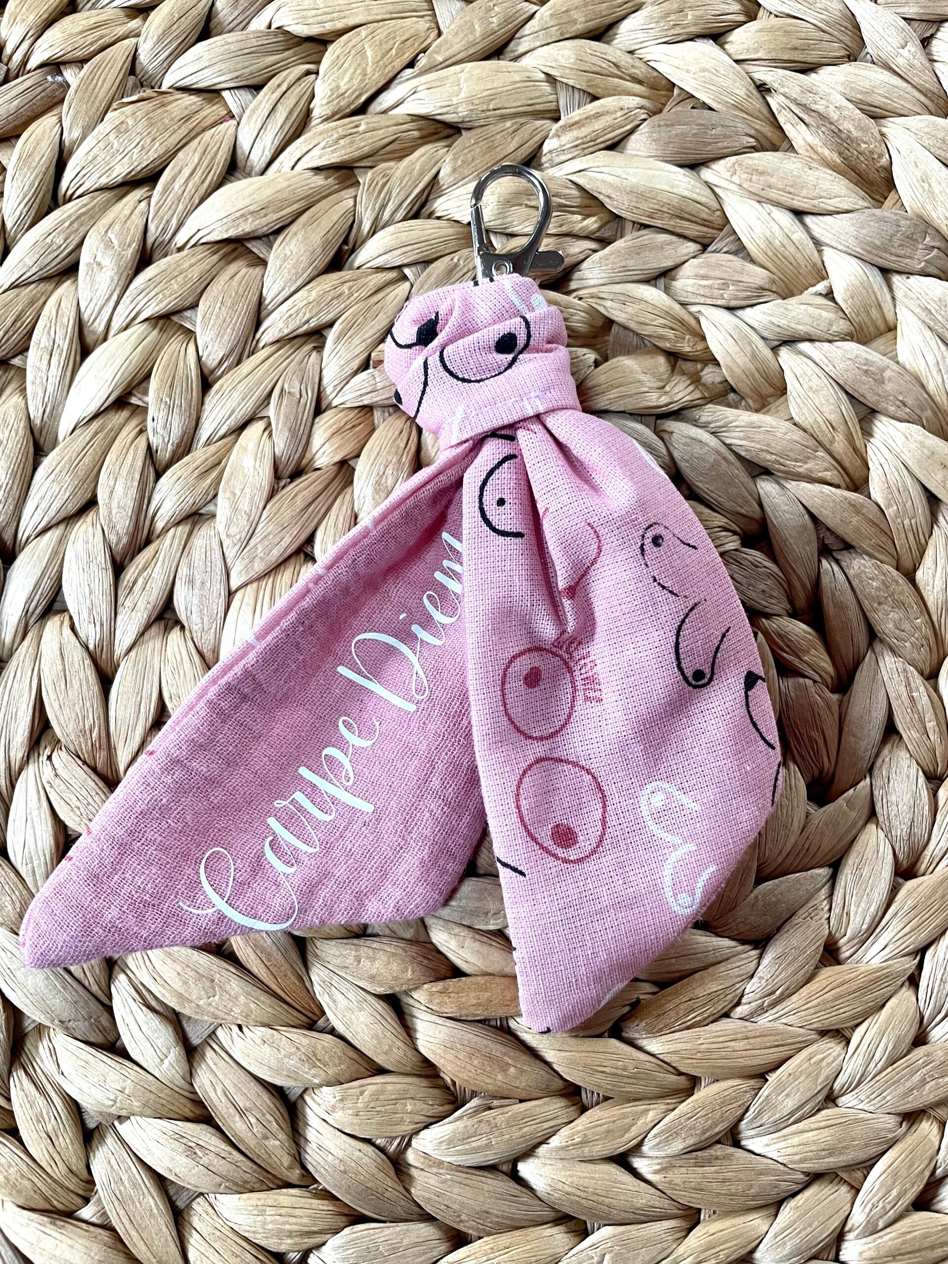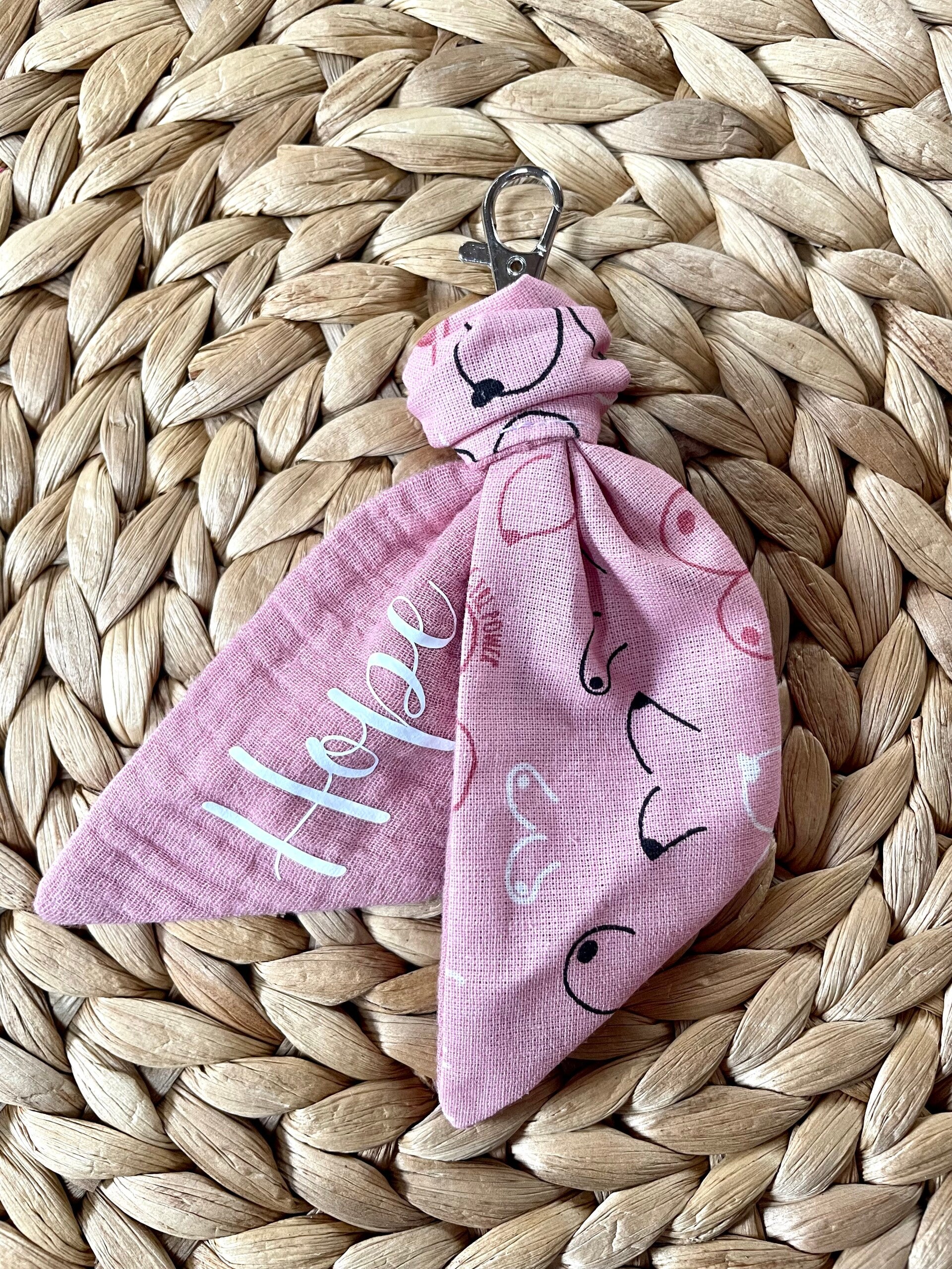 Porte clés en coton et double gaze de coton avec un mousqueton en métal pratique pour l'attacher facilement sur les clés, le sac,...