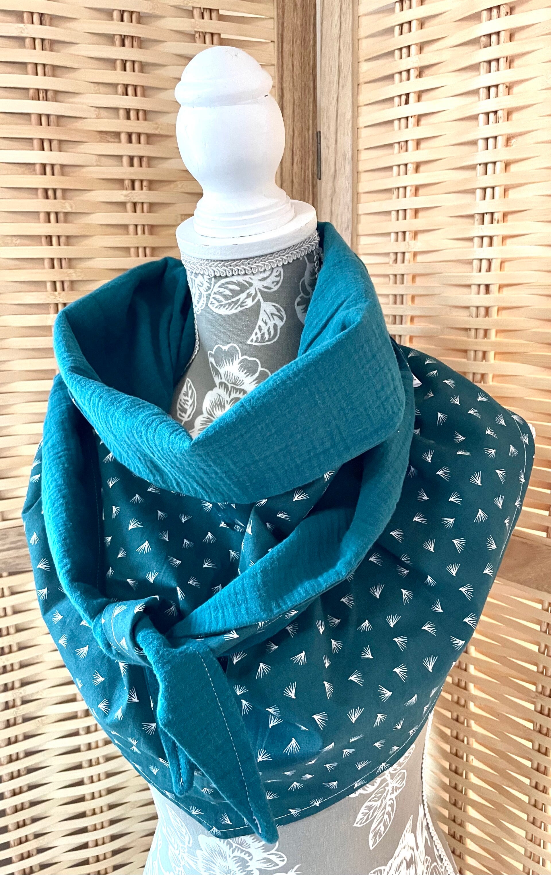 Chèche léger et idéal à porter en toutes saisons! Il est en forme triangle et peut se porter des deux côtés selon l’effet souhaité: plus coloré ou plus simple du côté uni.