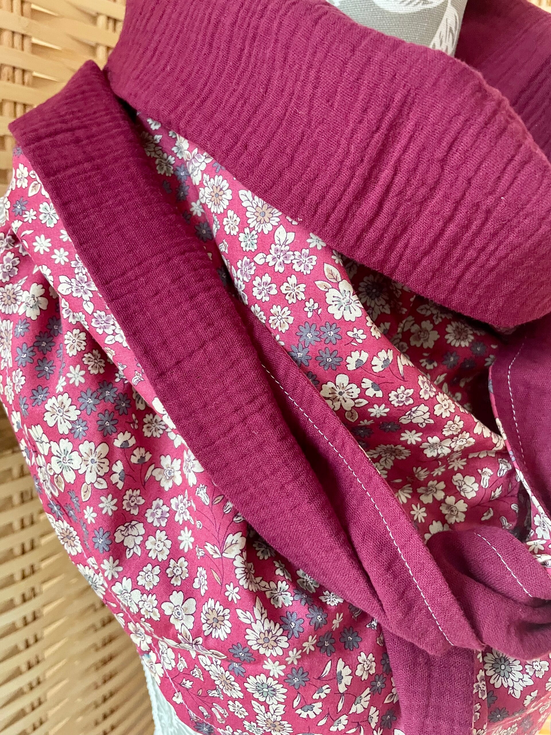 Chèche femme en coton imprimé fleuri rose foncé doublure prune