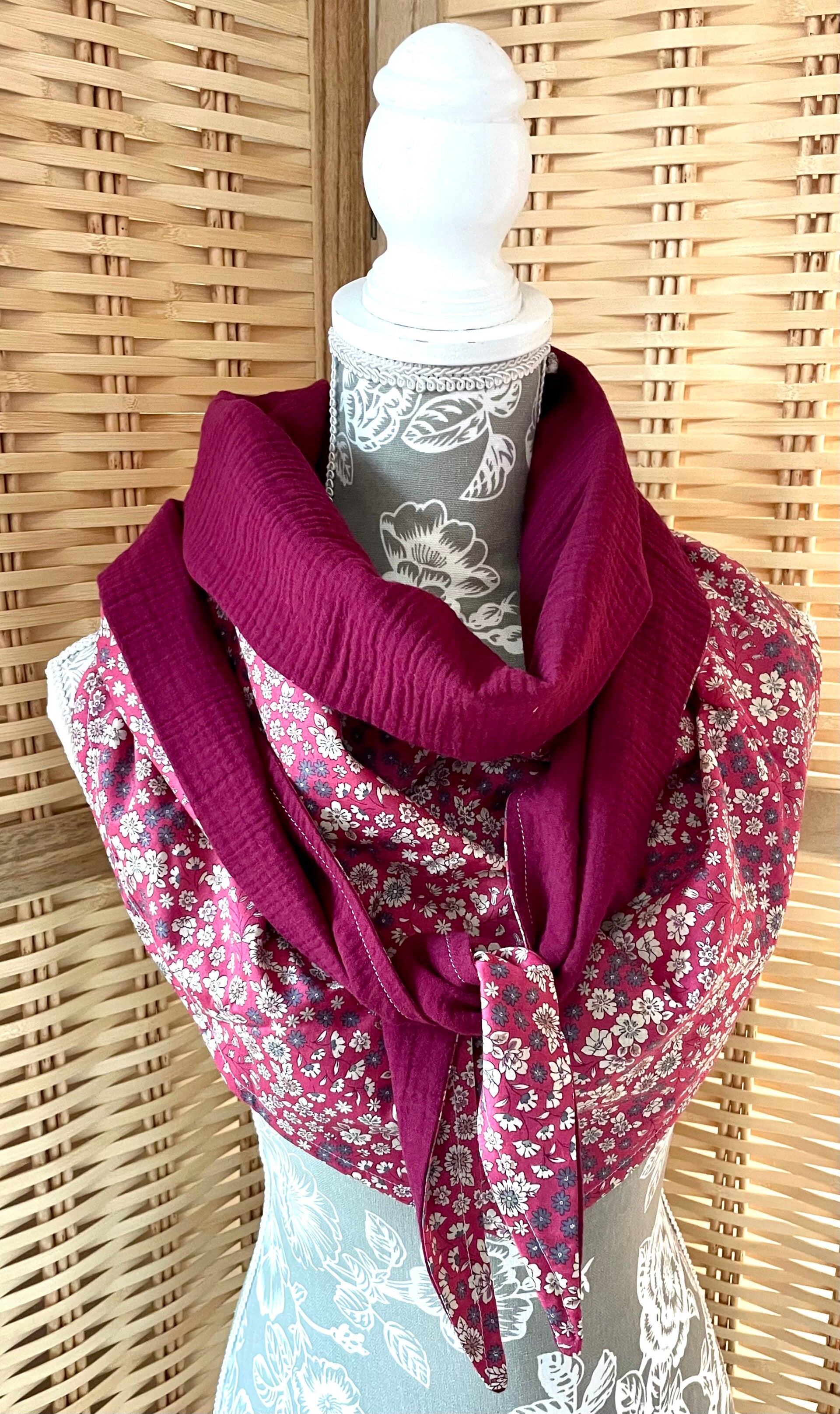Chèche léger et idéal à porter en toutes saisons! Il est en forme triangle et peut se porter des deux côtés selon l’effet souhaité: plus coloré ou plus simple du côté uni.