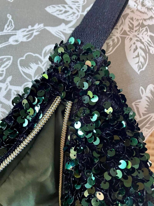 Cette banane "taille standard" a été cousu en tissu sequins avec une doublure 100% coton vert kaki.