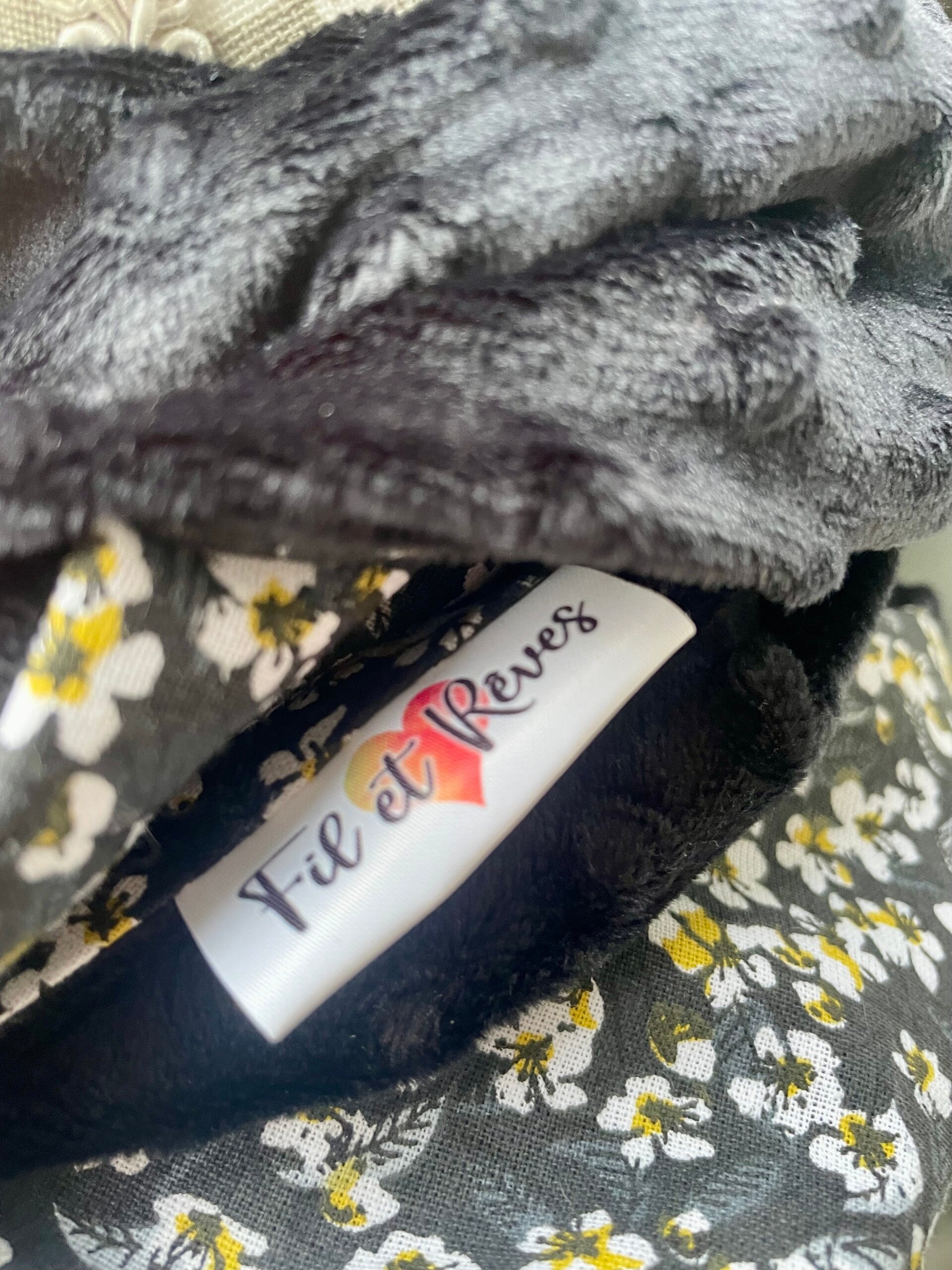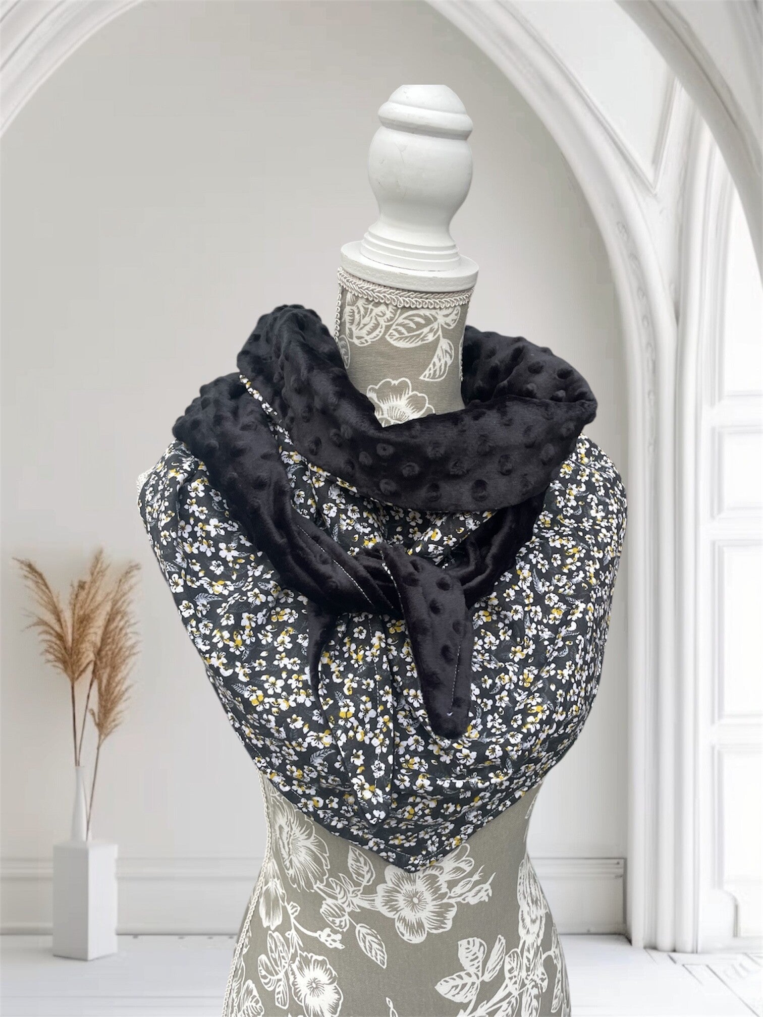 Chèche hiver femme en coton imprimé fleuri tons gris anthracite doublure minky noir