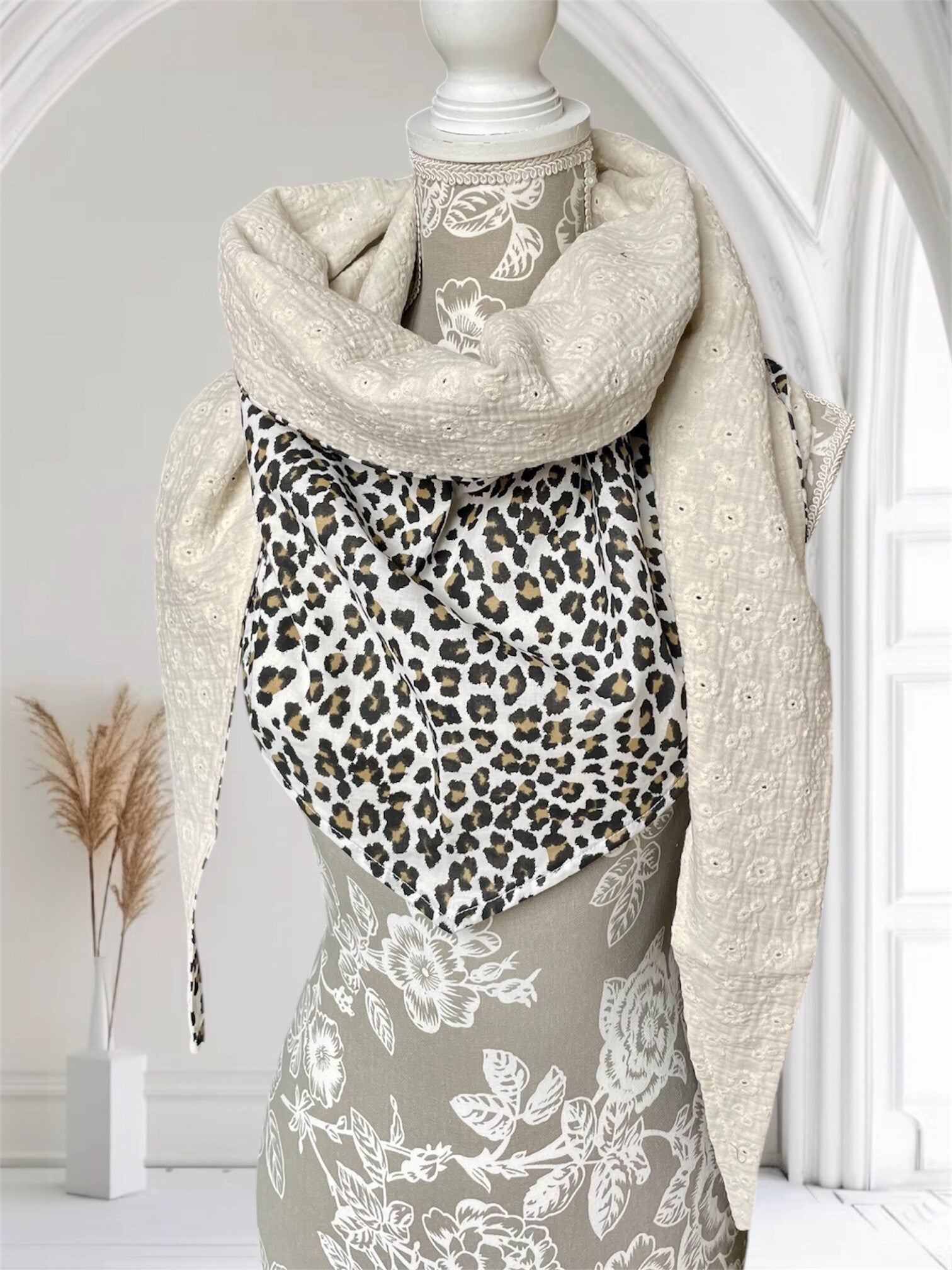 Chèche femme en coton léopard double gaze brodée écru
