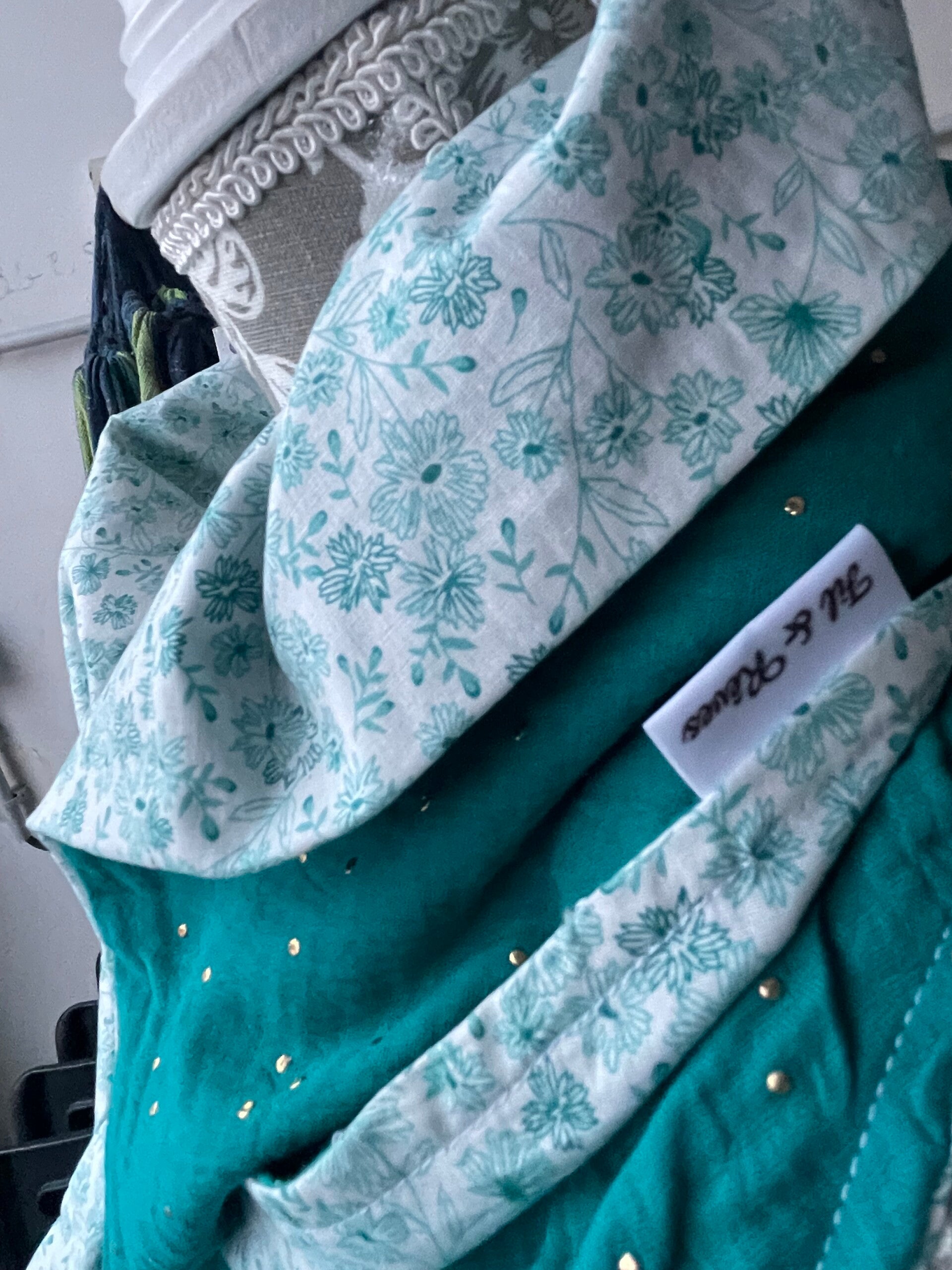Chèche léger et idéal à porter en toutes saisons! Il est en forme triangle et peut se porter des deux côtés selon l’effet souhaité: plus coloré ou plus simple du côté uni.