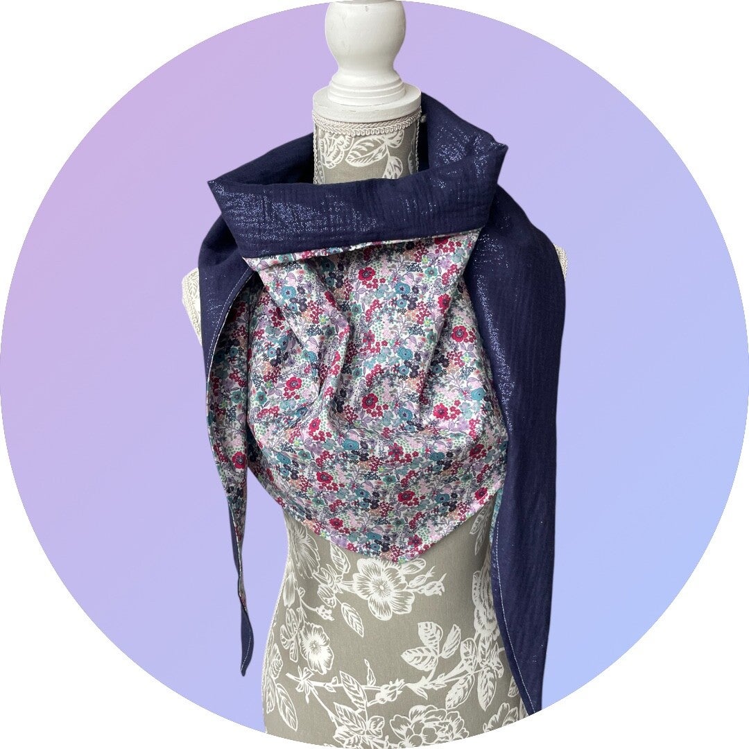 Chèche femme en coton fleuri doublure double gaze bleu foncé pailletée