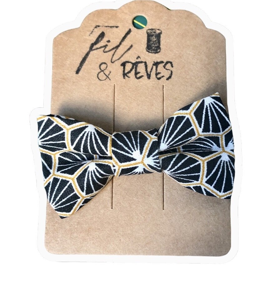 Barette en tissu 100% coton d'environ 3,5 x 6,5cm qui s'attache avec une pince crocodile d'environ 4 cm de long.