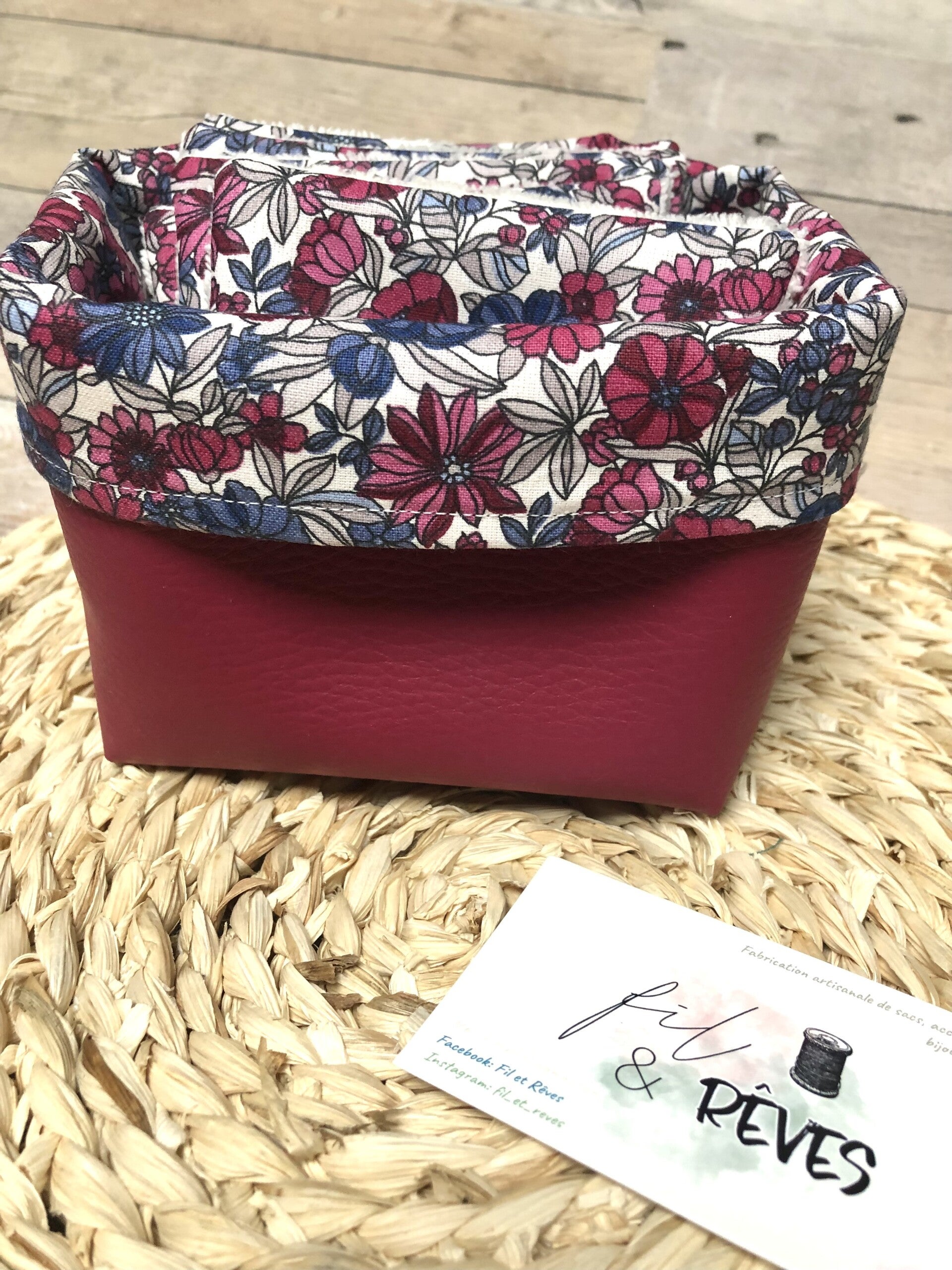 Panière de rangement en simili cuir et doublée en coton, elle vous permettra de ranger vos lingettes mais également votre maquillage, petits produits de toilettes,...etc.