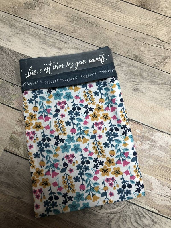 Pochette livre de poche motif fleurs tons bleu / rose / jaune