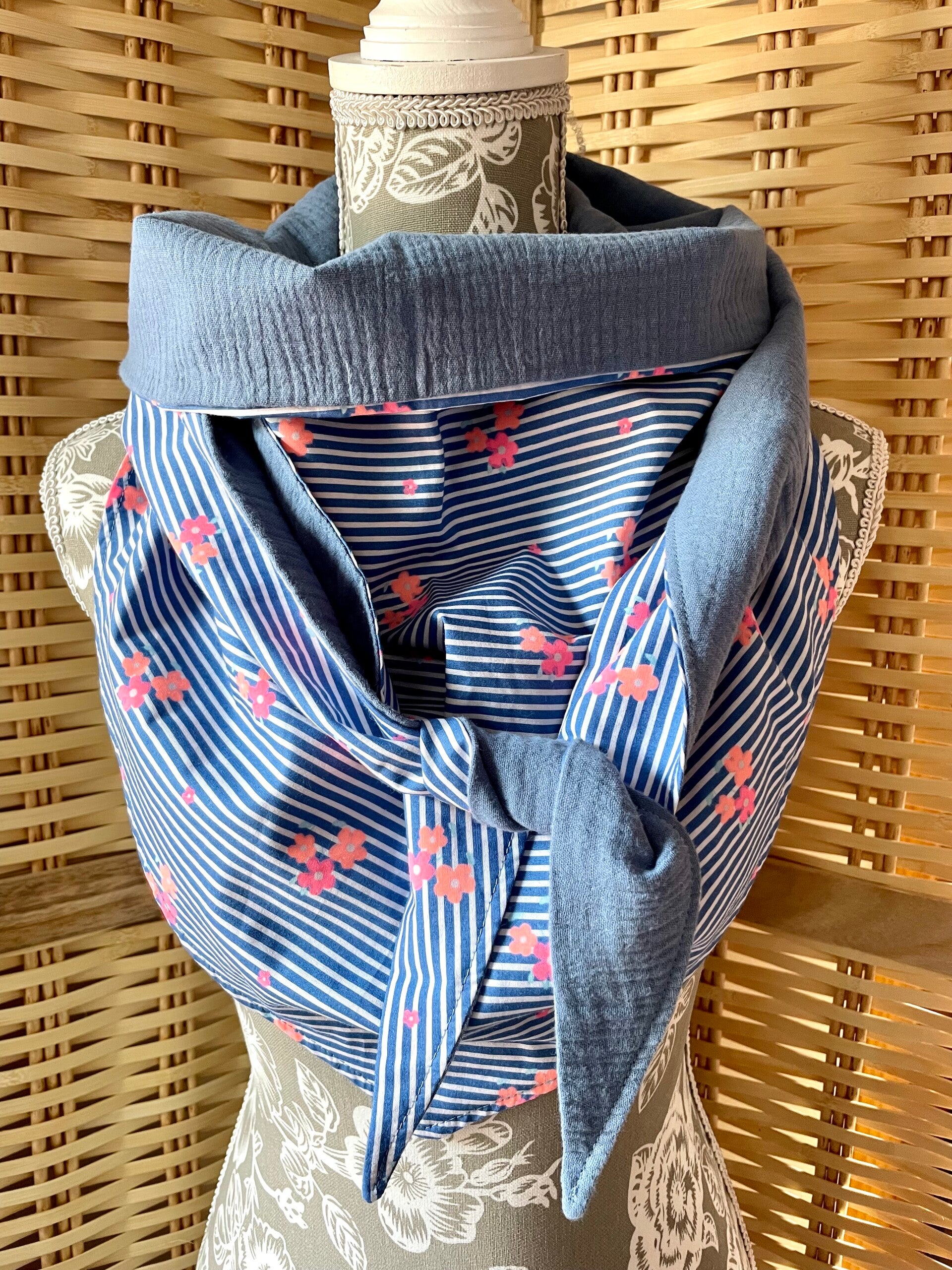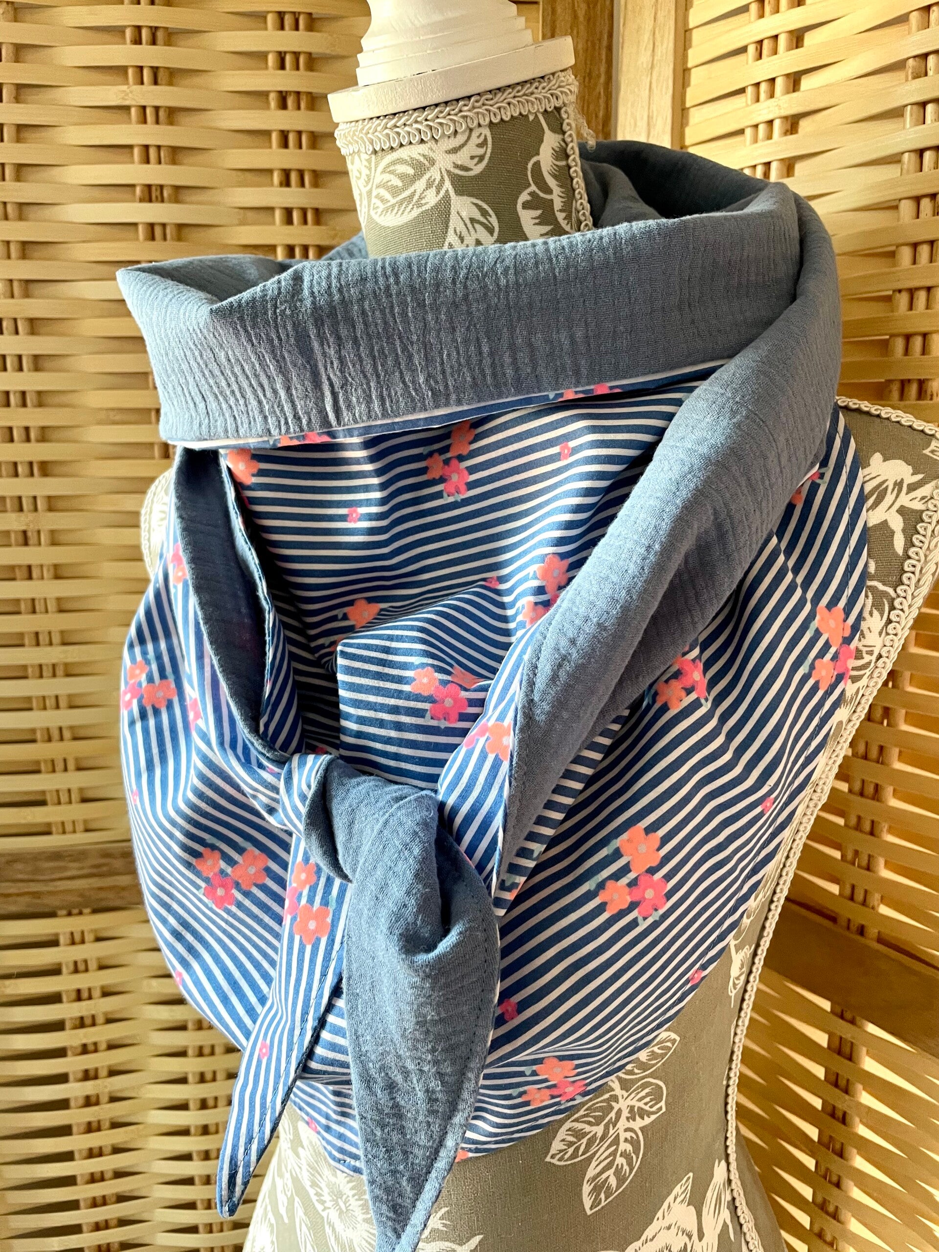 Chèche léger et idéal à porter en toutes saisons! Il est en forme triangle et peut se porter des deux côtés selon l’effet souhaité: plus coloré ou plus simple du côté uni.
