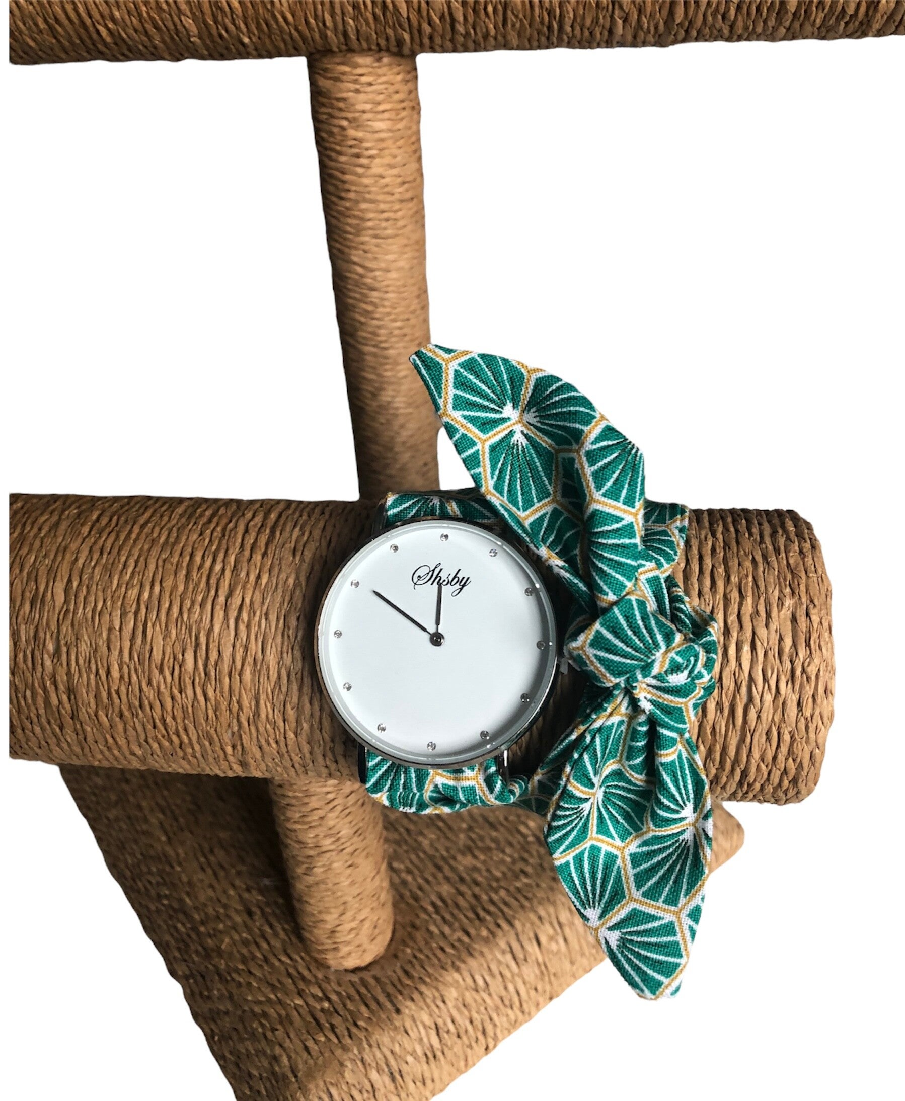 Montre à nouer avec bracelet personnalisable grâce aux nombreux tissus présents dans le catalogue.