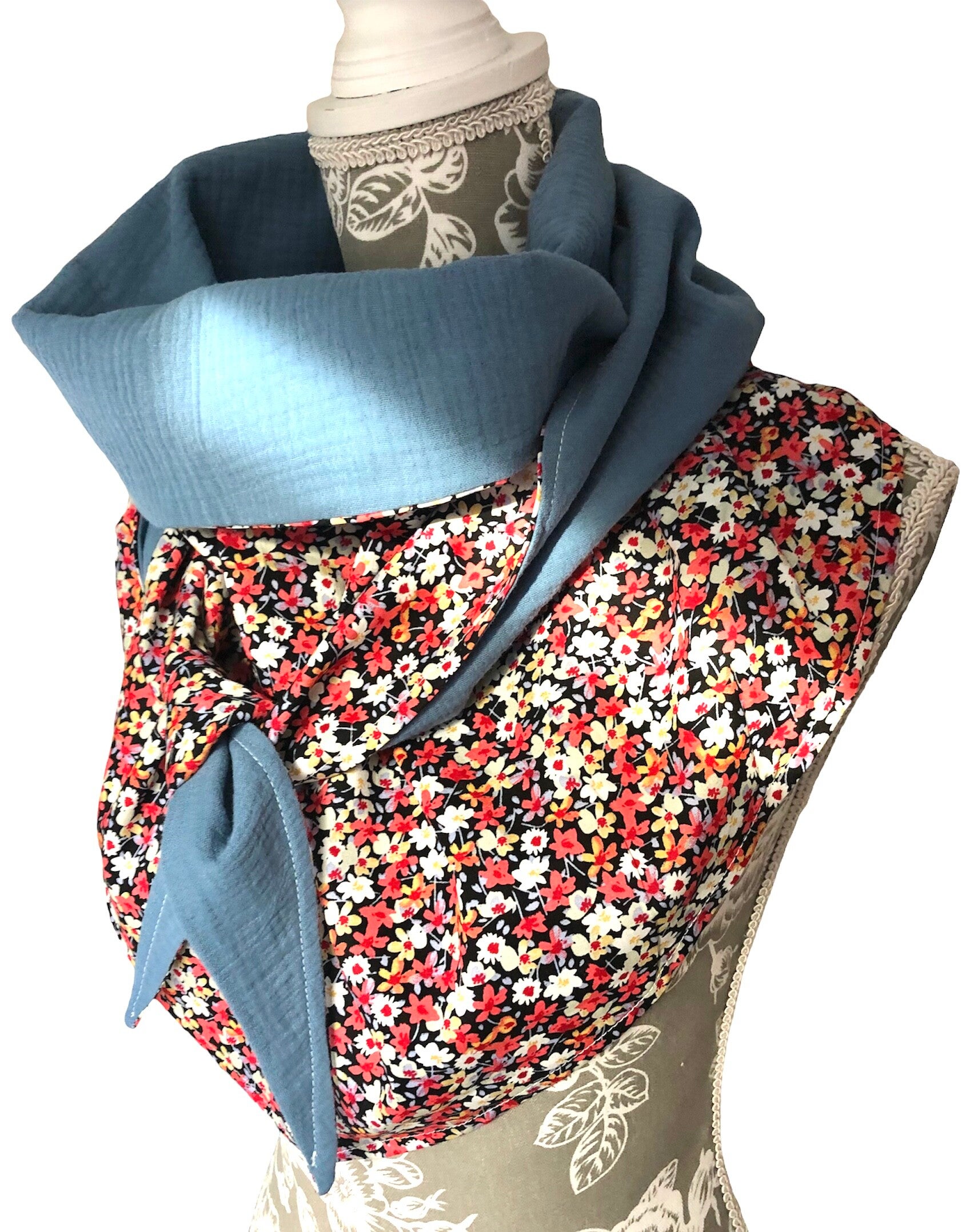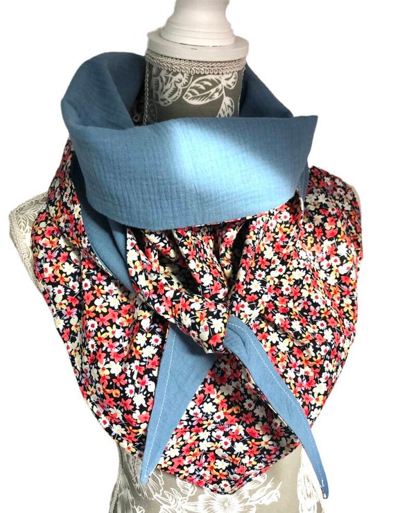 Chèche léger et idéal à porter en toutes saisons! Il est en forme triangle et peut se porter des deux côtés selon l’effet souhaité: plus coloré ou plus simple du côté uni.