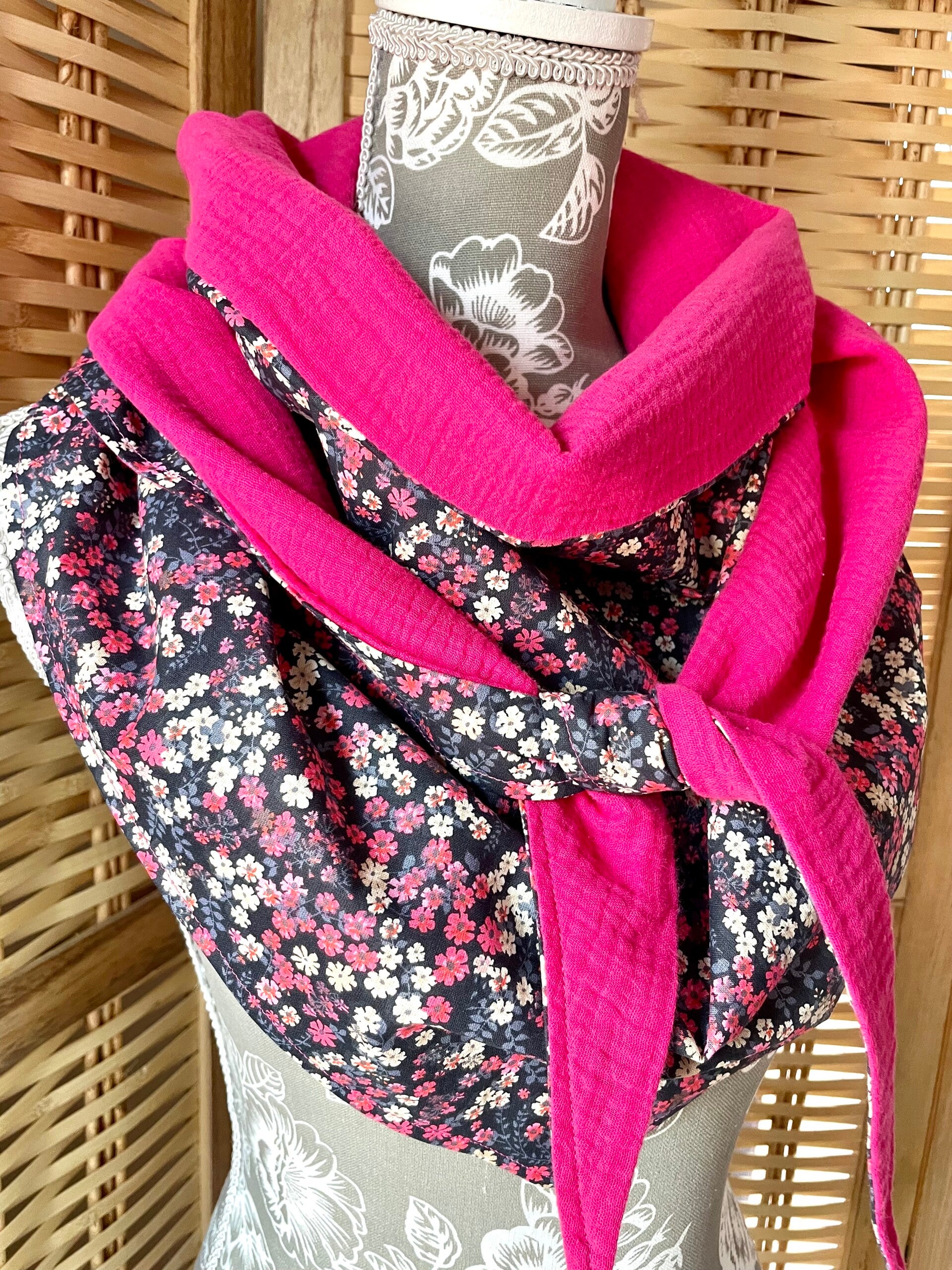 Chèche léger et idéal à porter en toutes saisons! Il est en forme triangle et peut se porter des deux côtés selon l’effet souhaité: plus coloré ou plus simple du côté uni.
