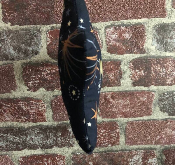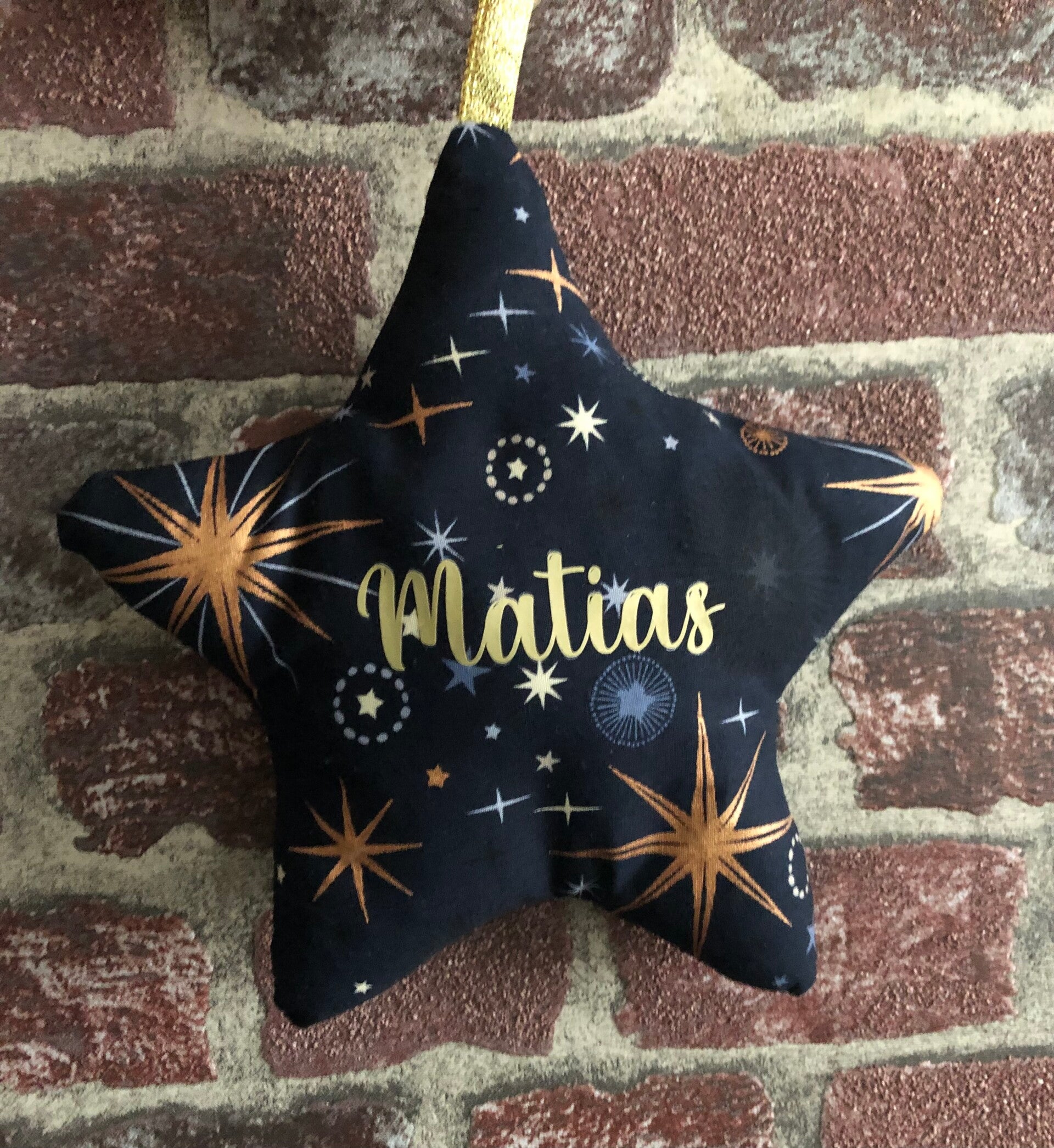Etoile de Noël en tissu 100% coton rembourée avec ruban doré pour l'accocher dans le sapin ou ailleurs et personnalisable!
