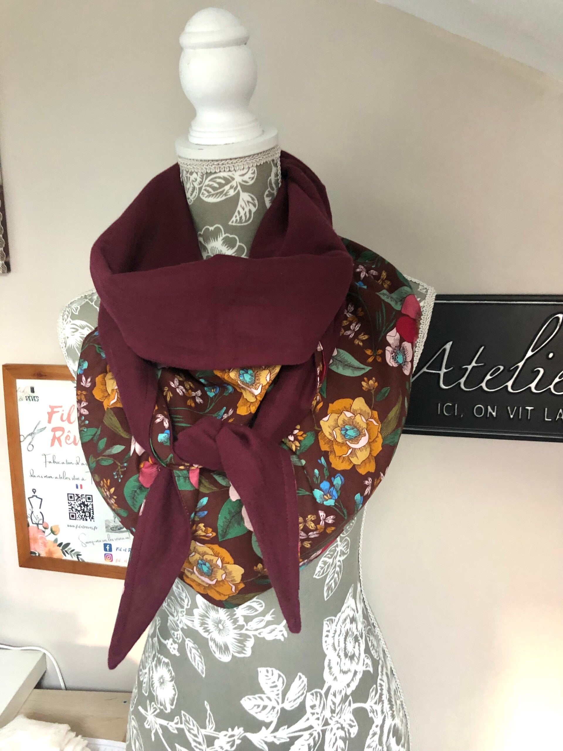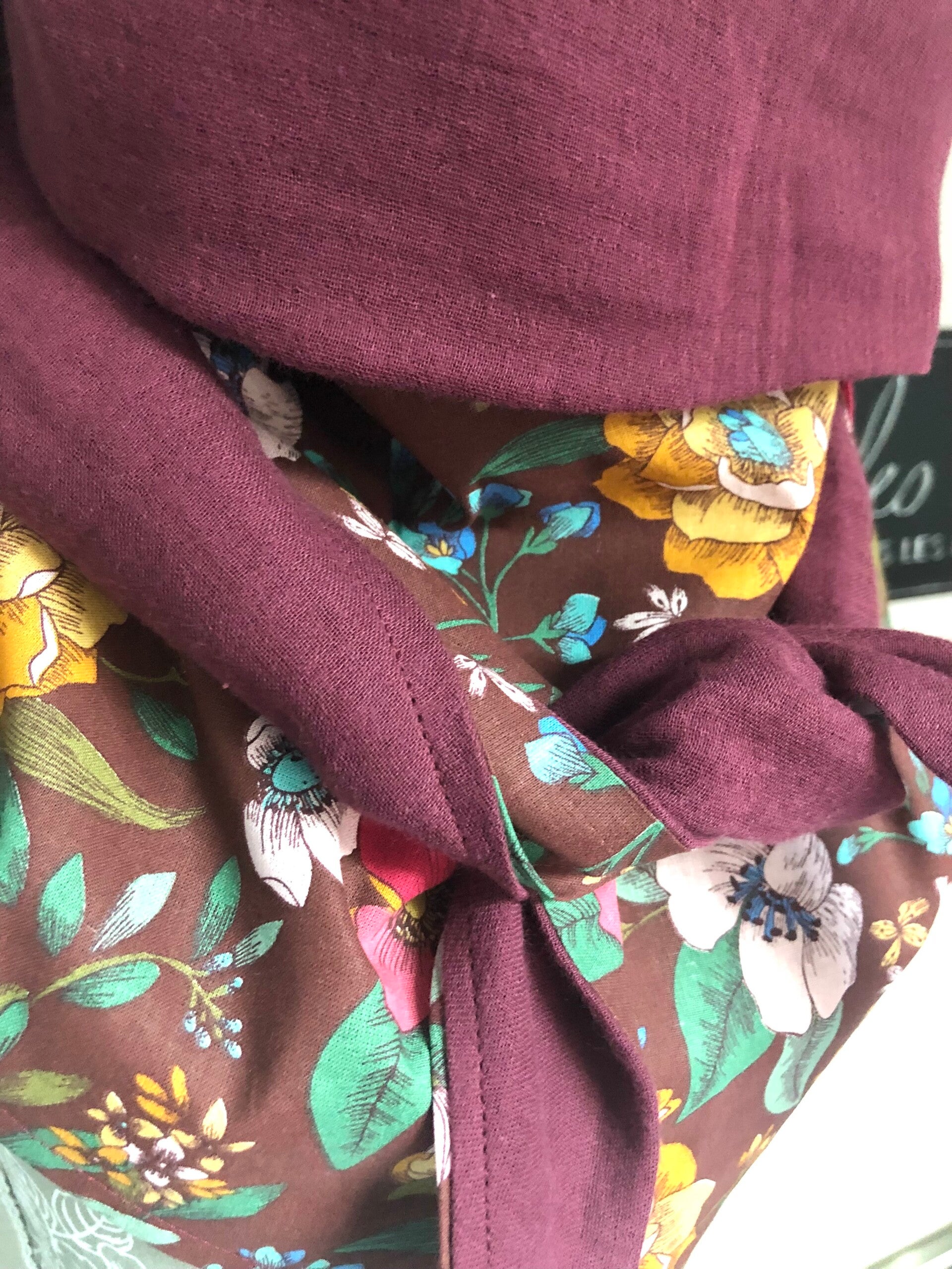 Chèche femme en coton imprimé fleurs bordeaux prune