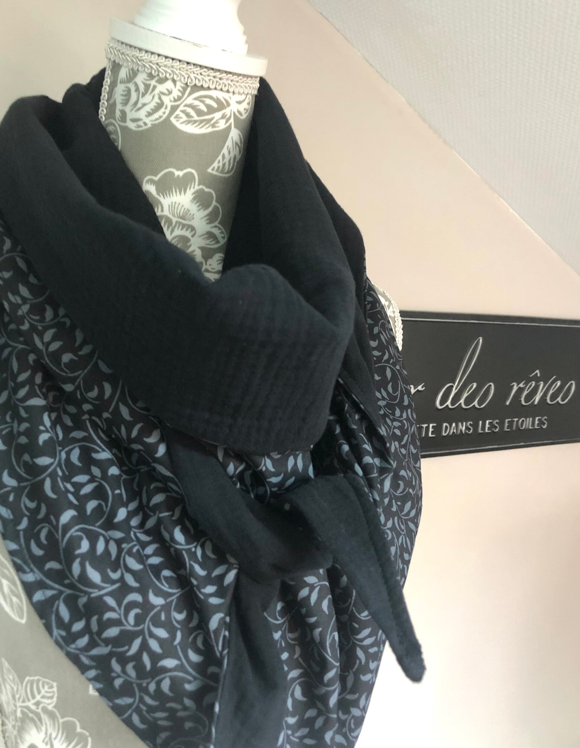 Chèche léger et idéal à porter en toutes saisons! Il est en forme triangle et peut se porter des deux côtés selon l’effet souhaité: plus coloré ou plus simple du côté uni.