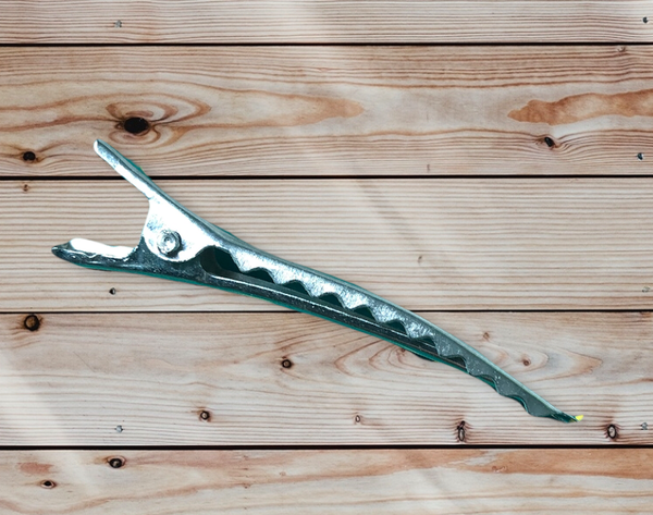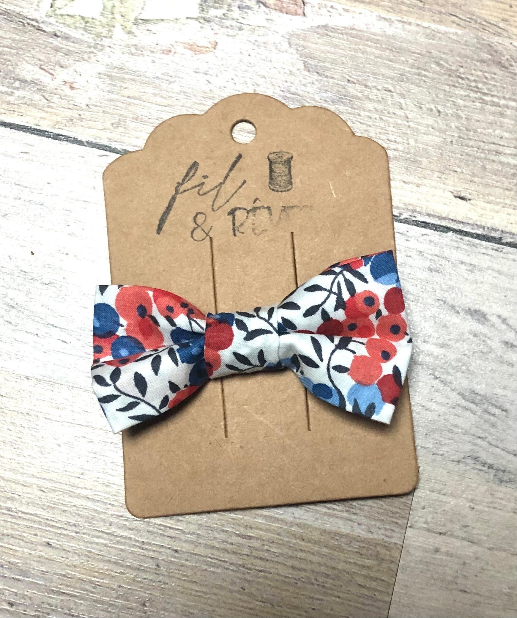 Barette en tissu 100% coton d'environ 3,5 x 6,5cm qui s'attache avec une pince crocodile d'environ 4 cm de long.