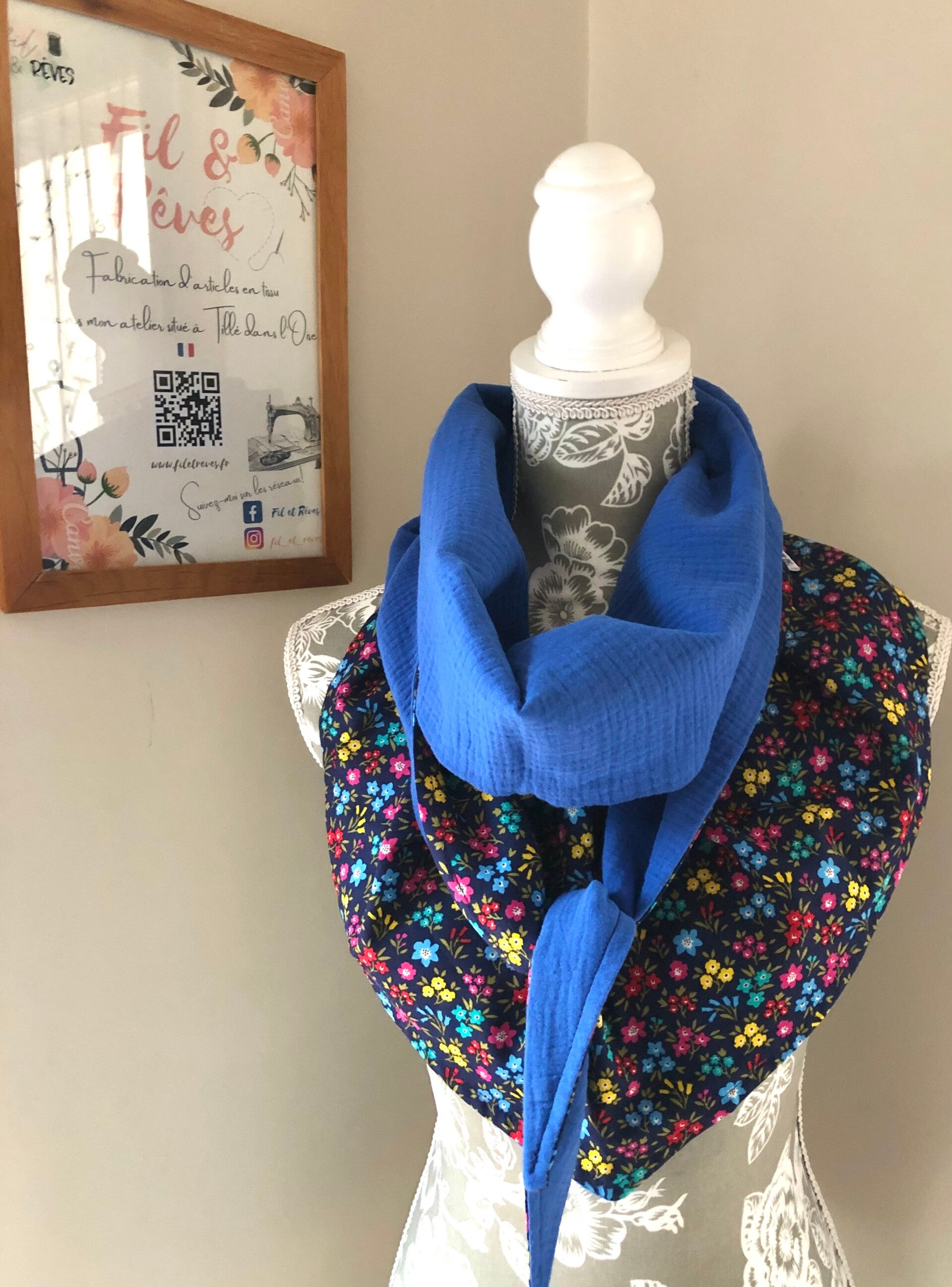 Chèche léger et idéal à porter en toutes saisons! Il est en forme triangle et peut se porter des deux côtés selon l’effet souhaité: plus coloré ou plus simple du côté uni.