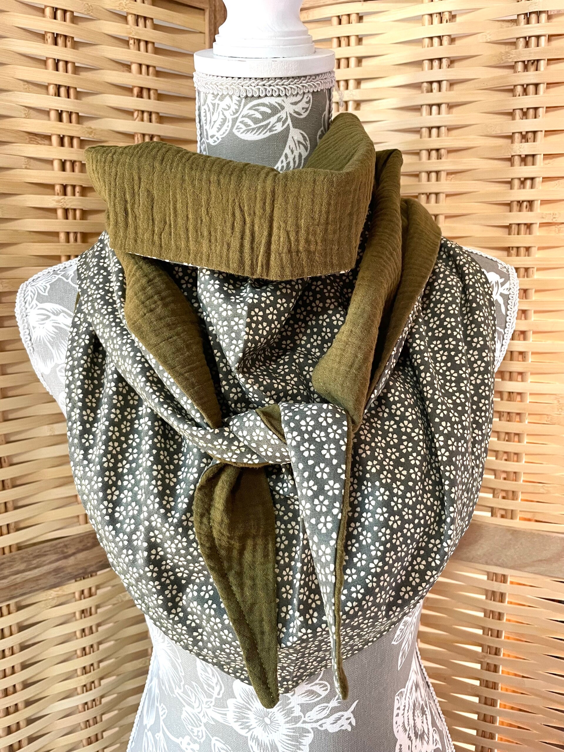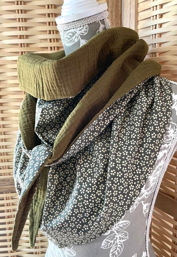 Chèche léger et idéal à porter en toutes saisons! Il est en forme triangle et peut se porter des deux côtés selon l’effet souhaité: plus coloré ou plus simple du côté uni.