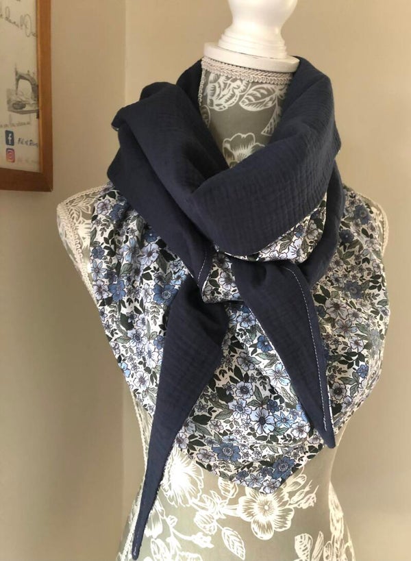 Chèche léger et idéal à porter en toutes saisons! Il est en forme triangle et peut se porter des deux côtés selon l’effet souhaité: plus coloré ou plus simple du côté uni.