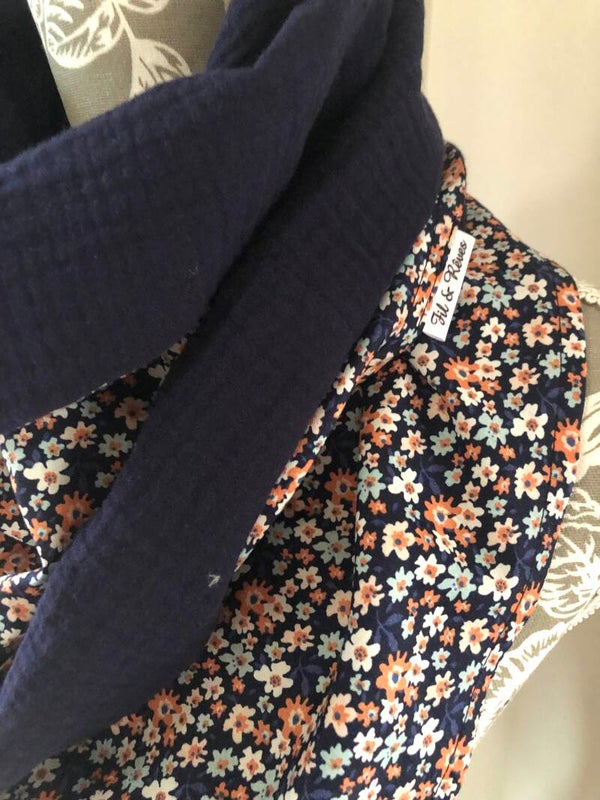 Chèche femme en coton bleu marine à fleurs saumon et bleu