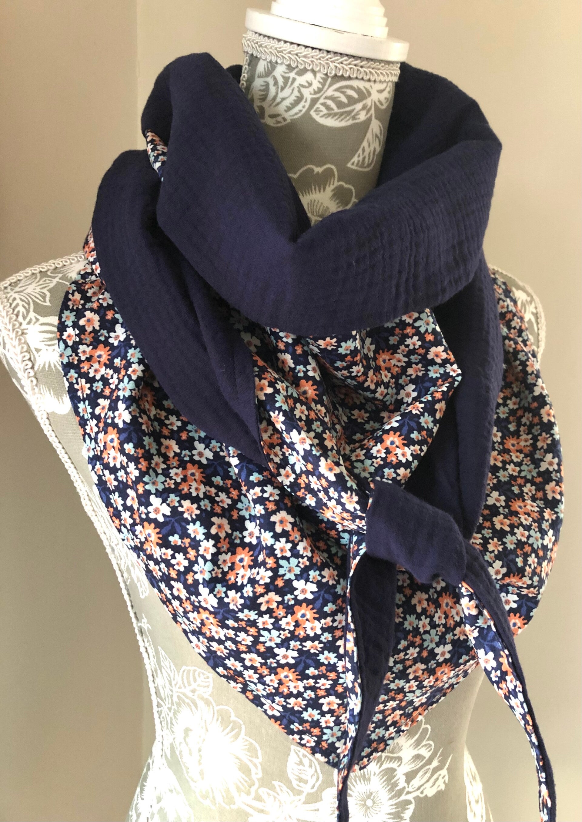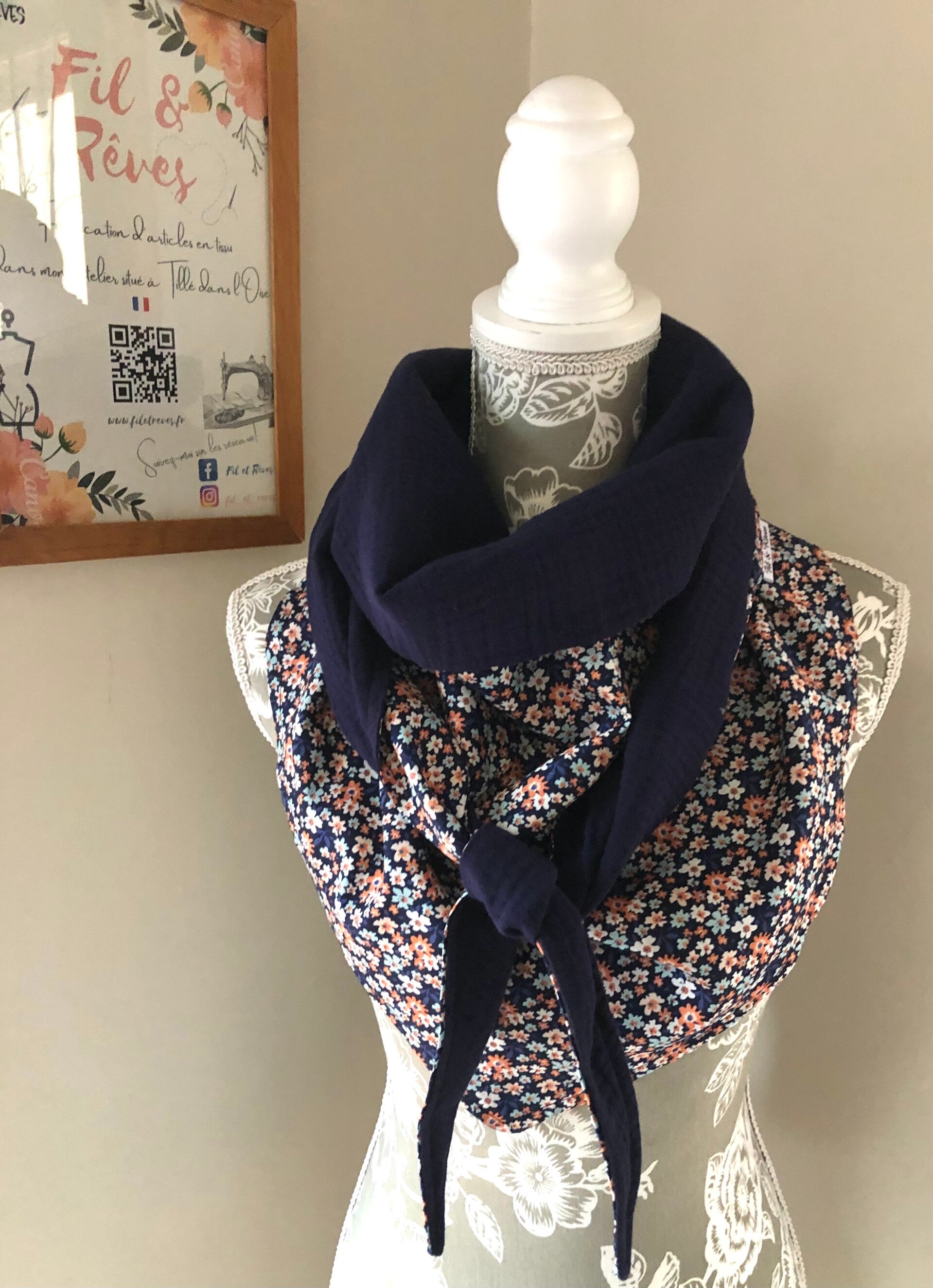 Chèche léger et idéal à porter en toutes saisons! Il est en forme triangle et peut se porter des deux côtés selon l’effet souhaité: plus coloré ou plus simple du côté uni.