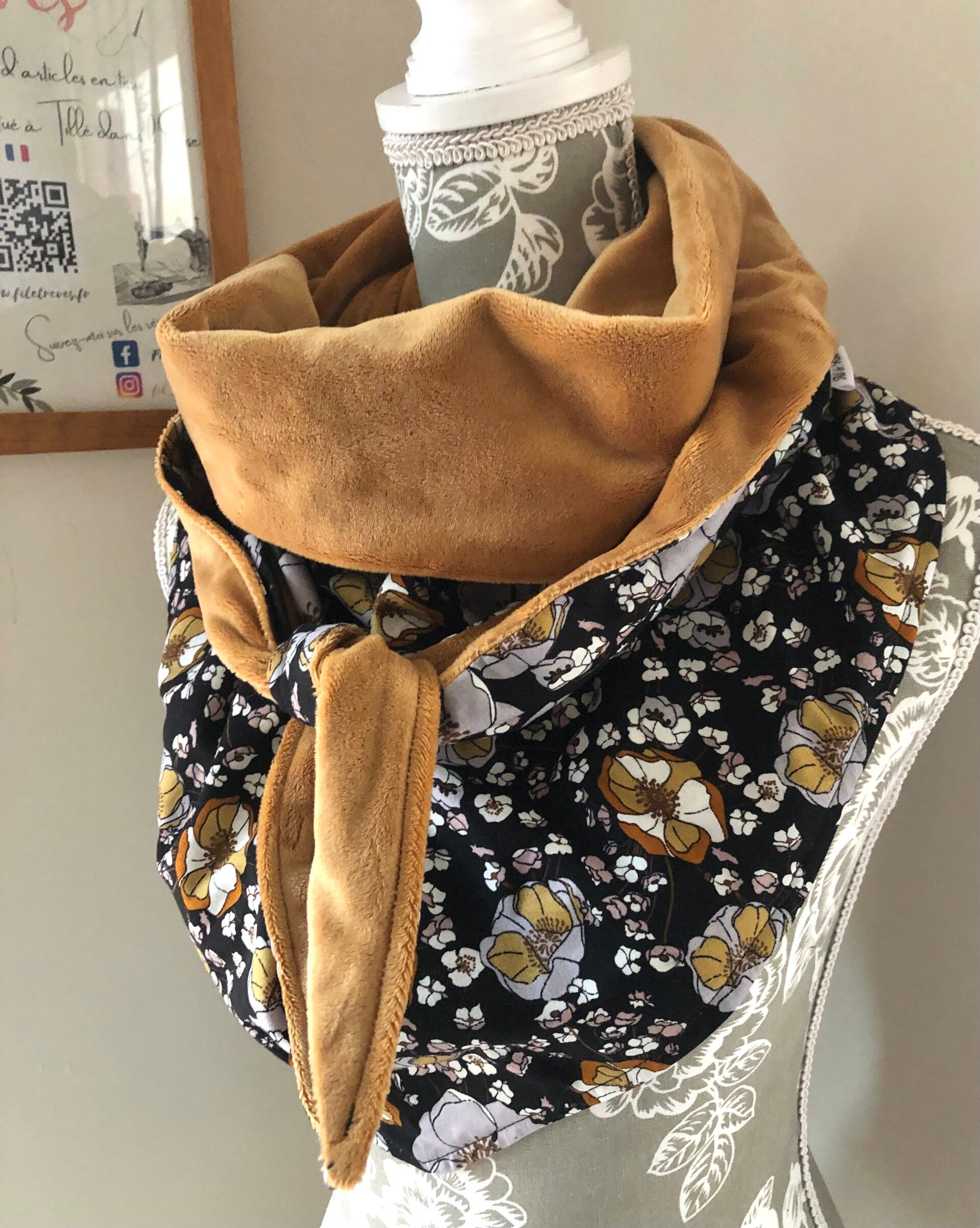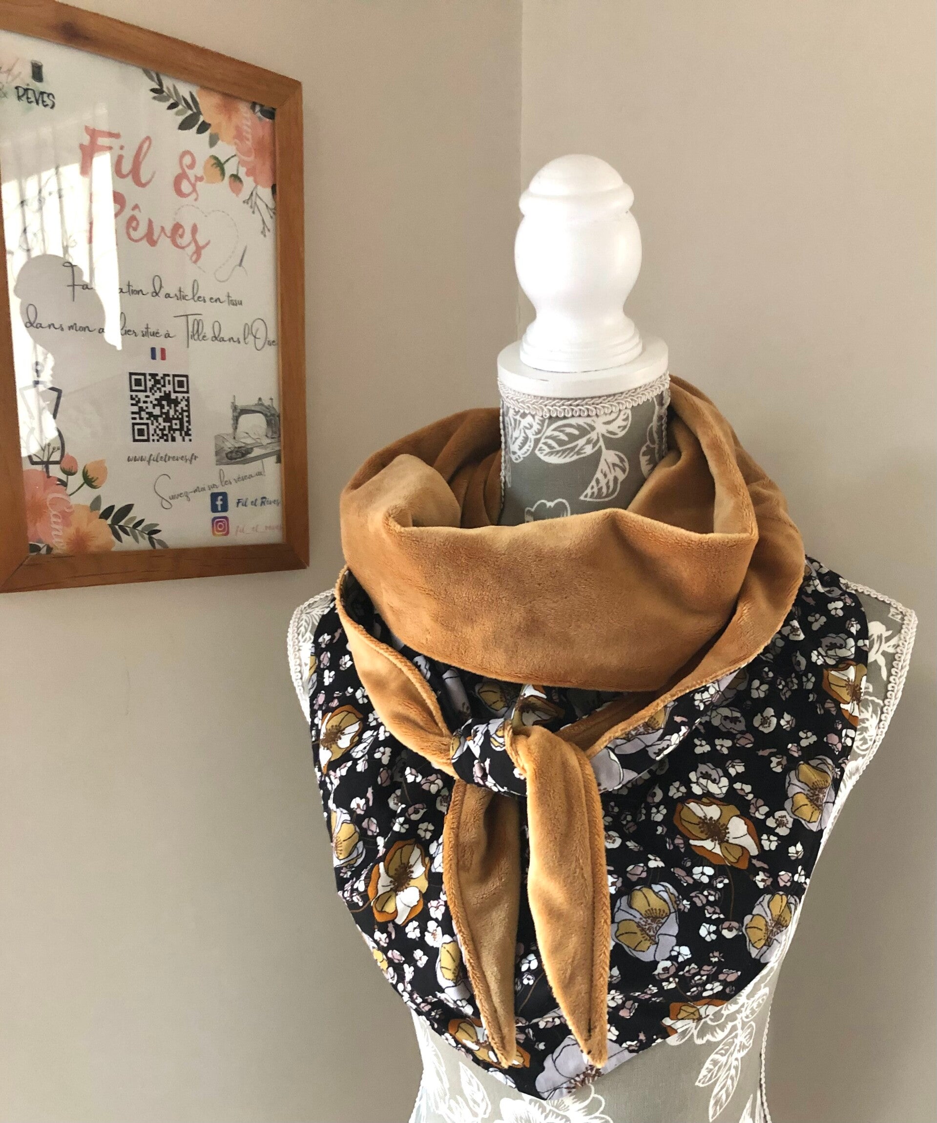 Chèche femme en coton noir à fleurs doublé polaire camel