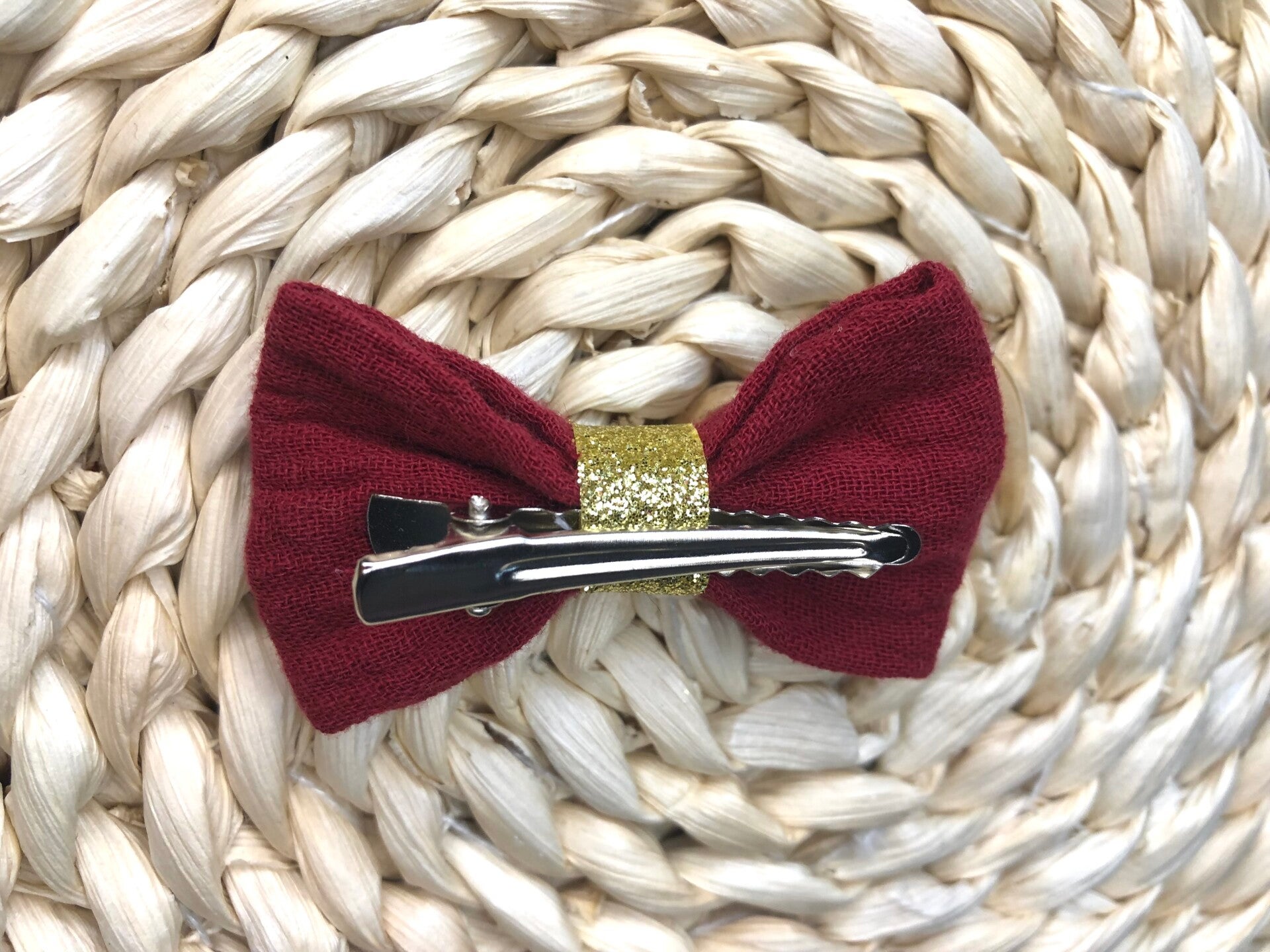 Barrette en double gaze de coton d'environ 3,5 x 6,5cm qui s'attache avec une pince crocodile d'environ 4 cm de long.