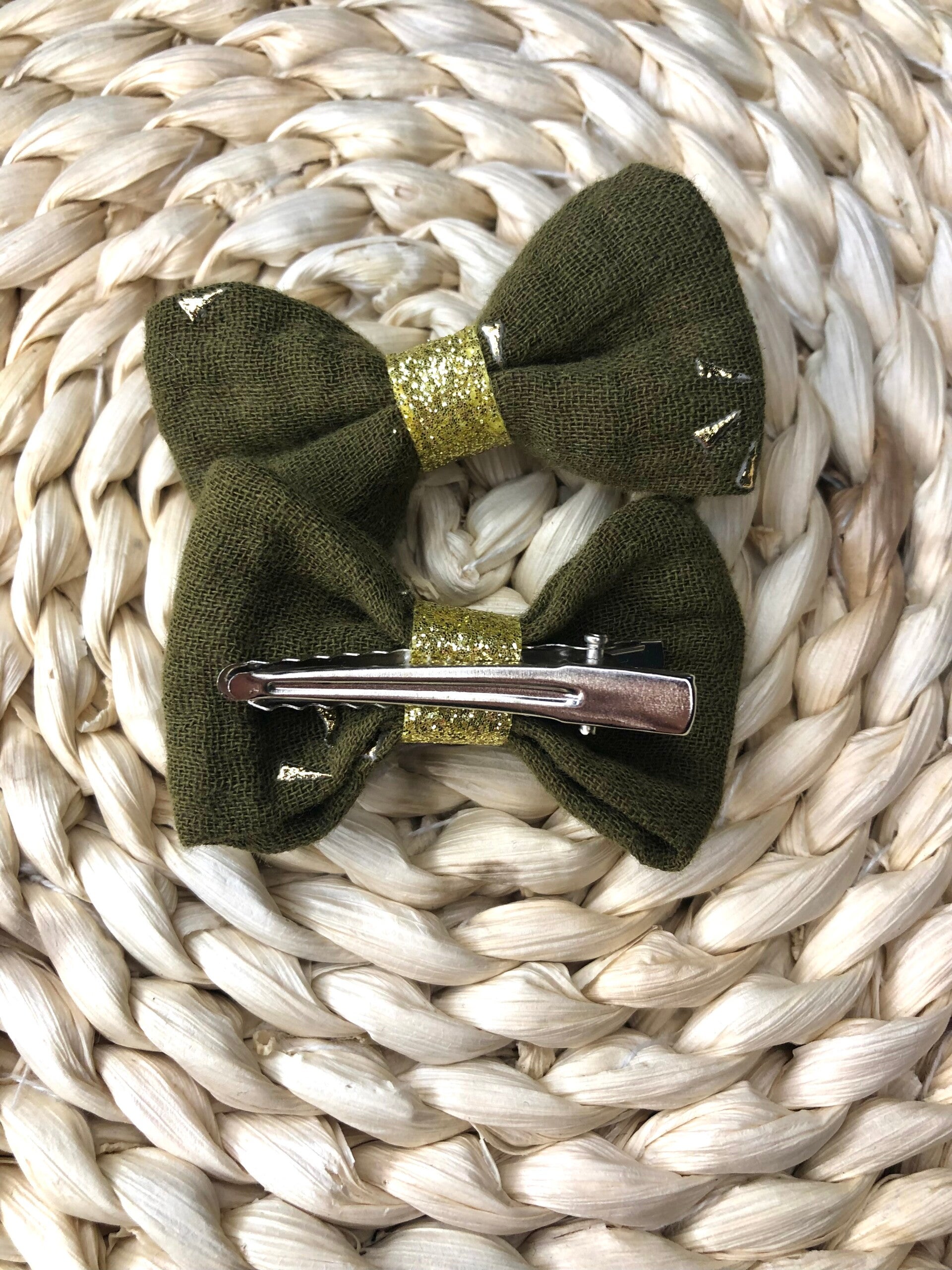 Barrette en double gaze de coton d'environ 3,5 x 6,5cm qui s'attache avec une pince crocodile d'environ 4 cm de long.
