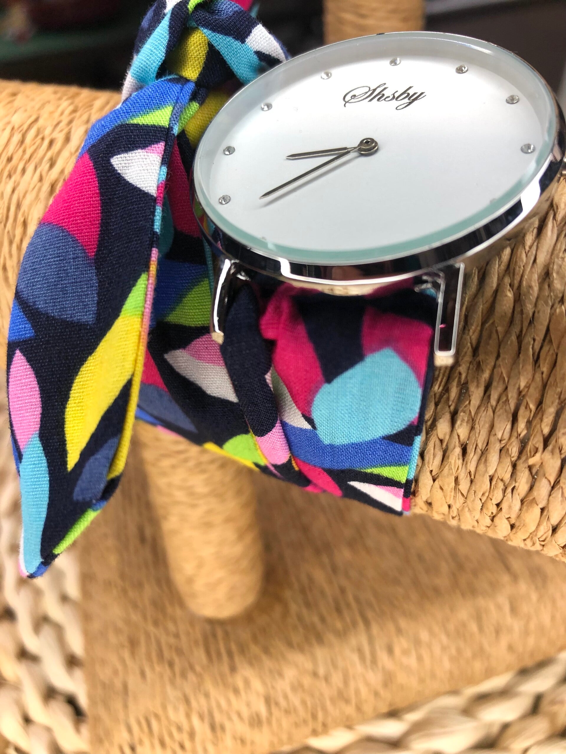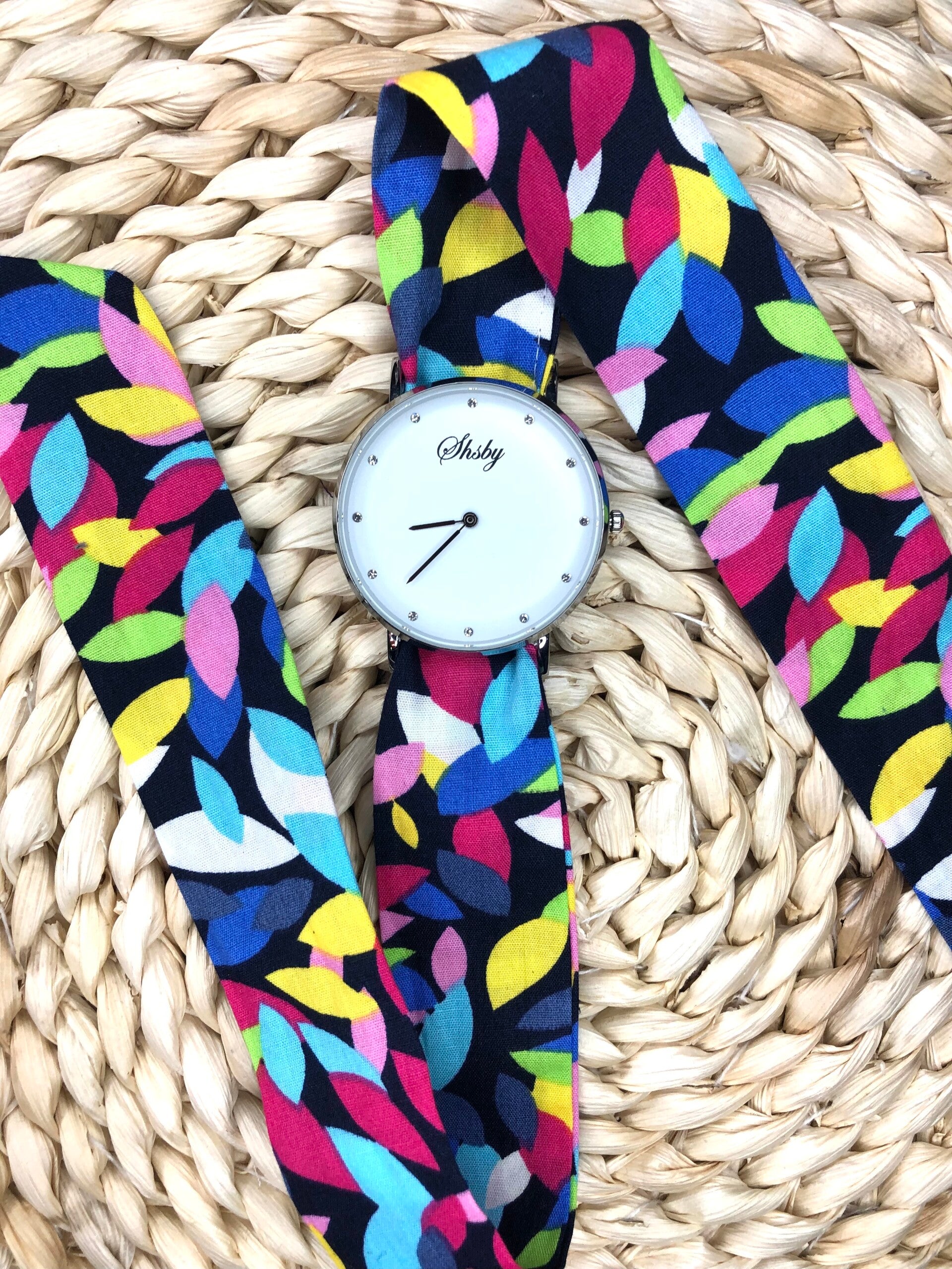 Montre à nouer avec bracelet personnalisable grâce aux nombreux tissus présents dans le catalogue.