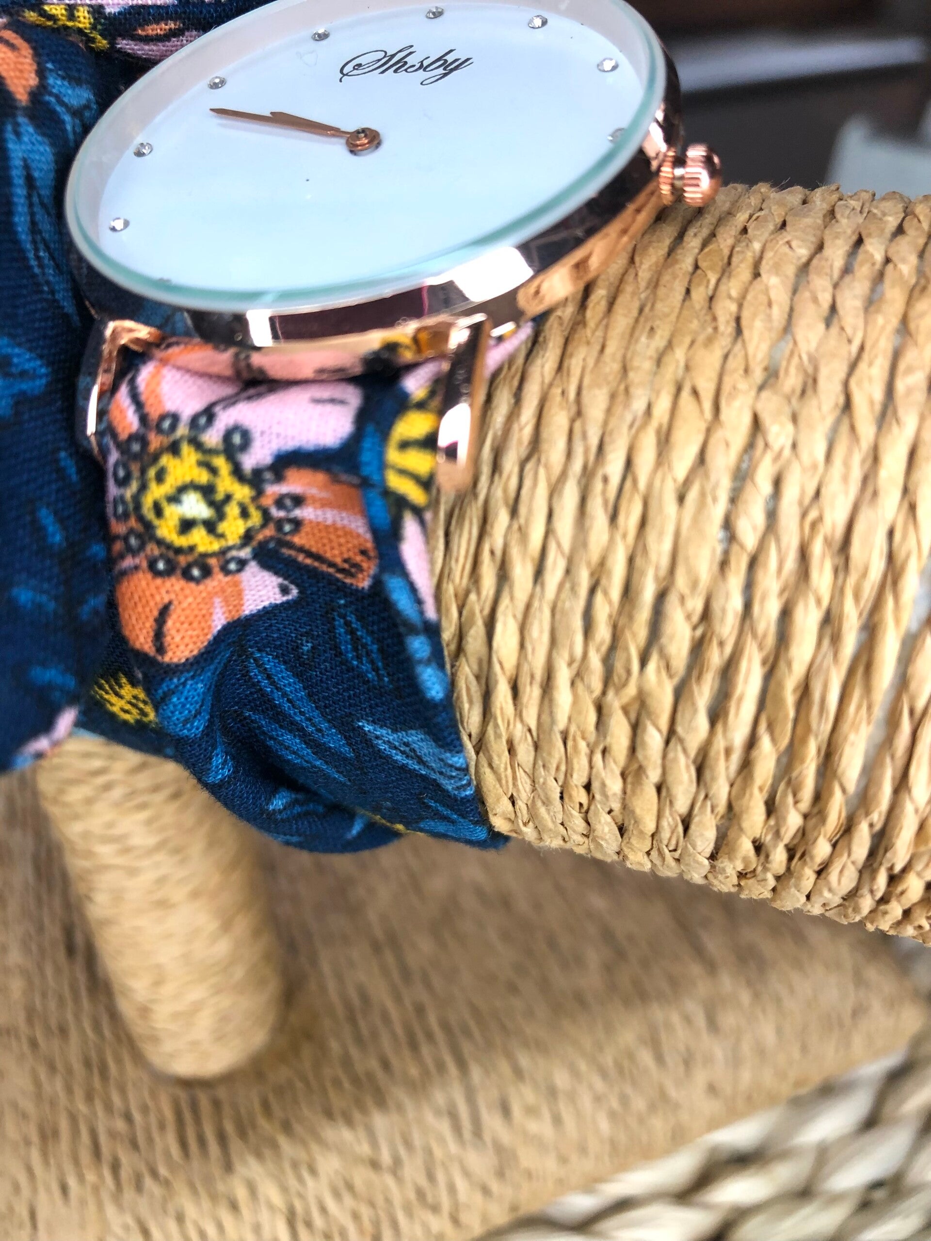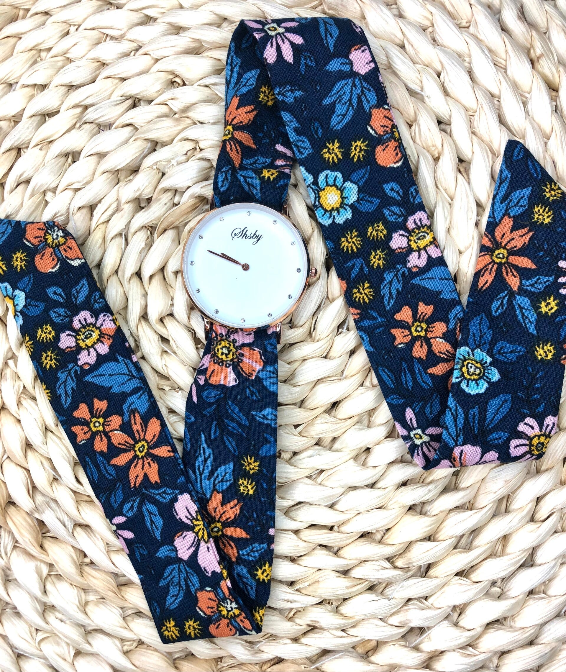 Montre à nouer avec bracelet personnalisable grâce aux nombreux tissus présents dans le catalogue.