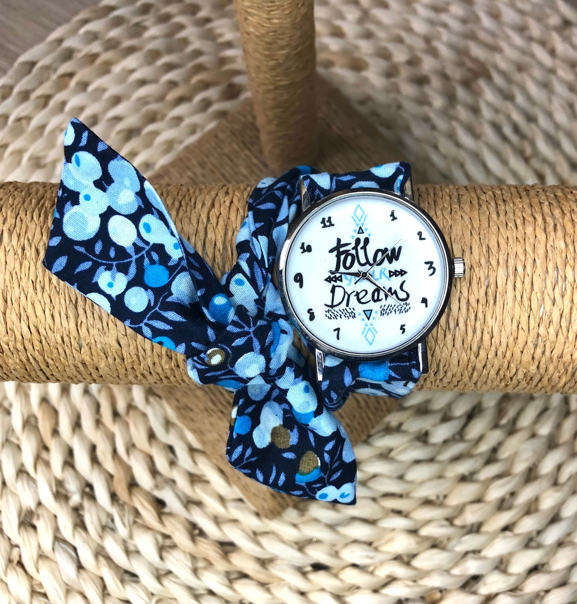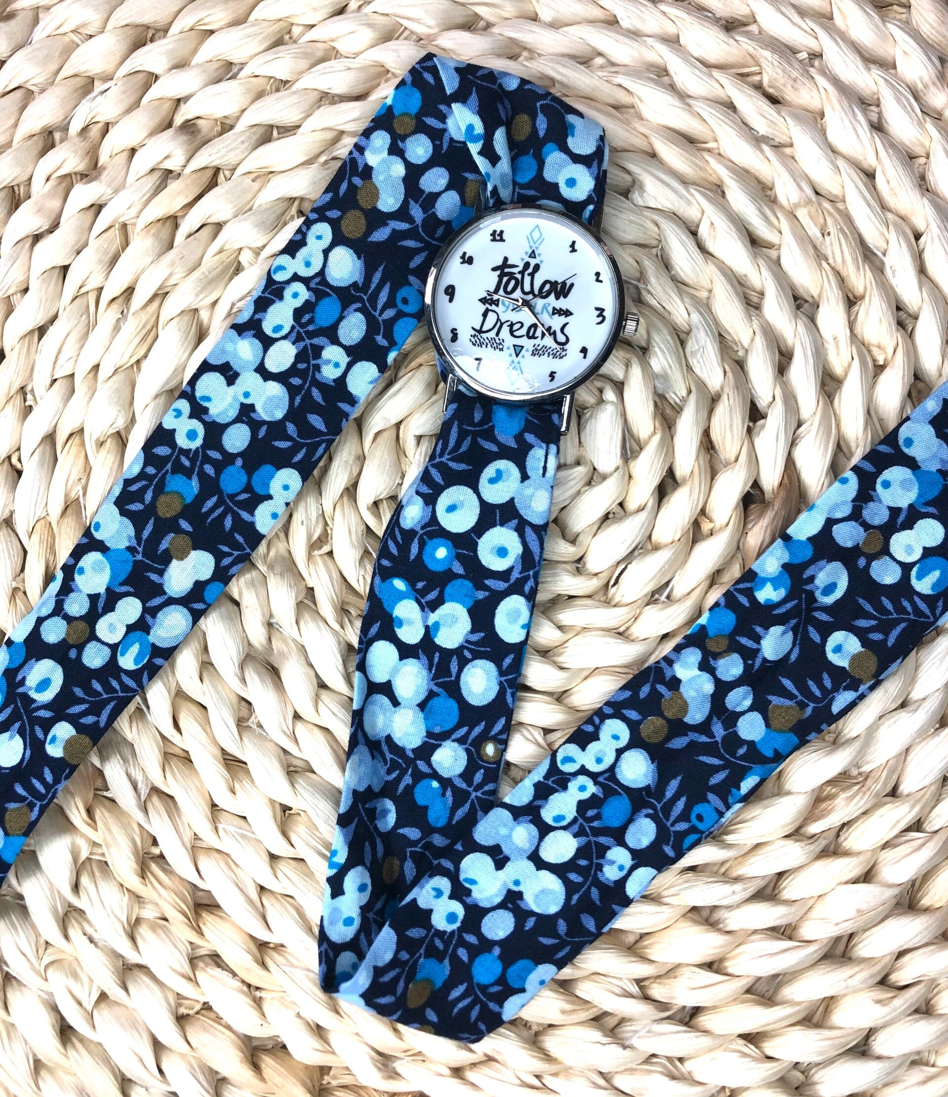 Montre à nouer avec bracelet personnalisable grâce aux nombreux tissus présents dans le catalogue.