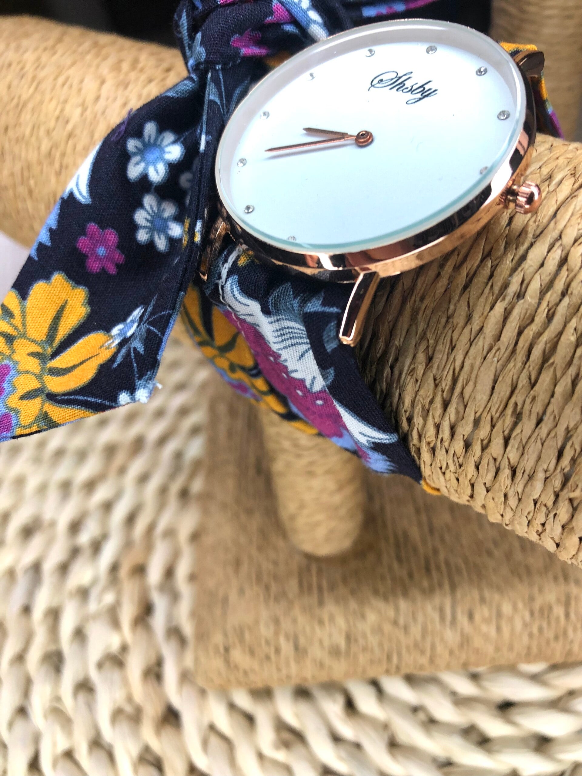 Montre à nouer avec bracelet personnalisable grâce aux nombreux tissus présents dans le catalogue.