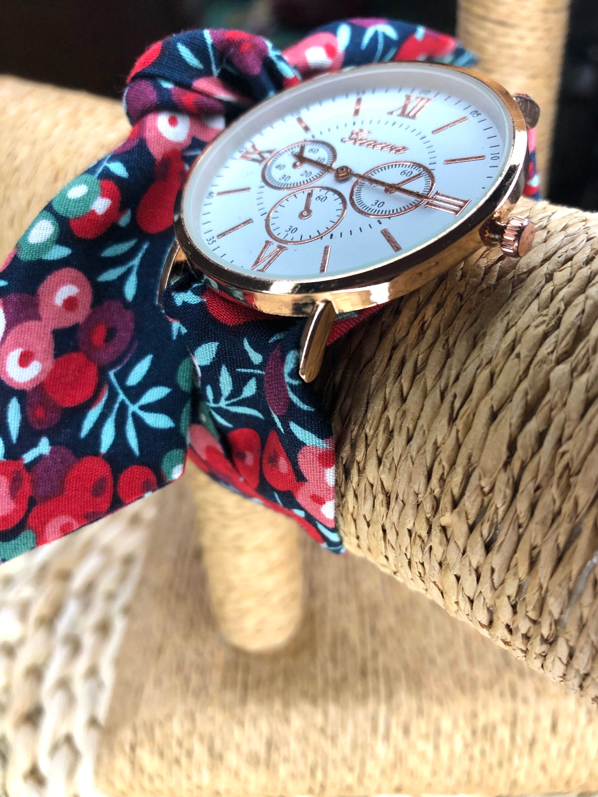 Montre à nouer avec bracelet personnalisable grâce aux nombreux tissus présents dans le catalogue.