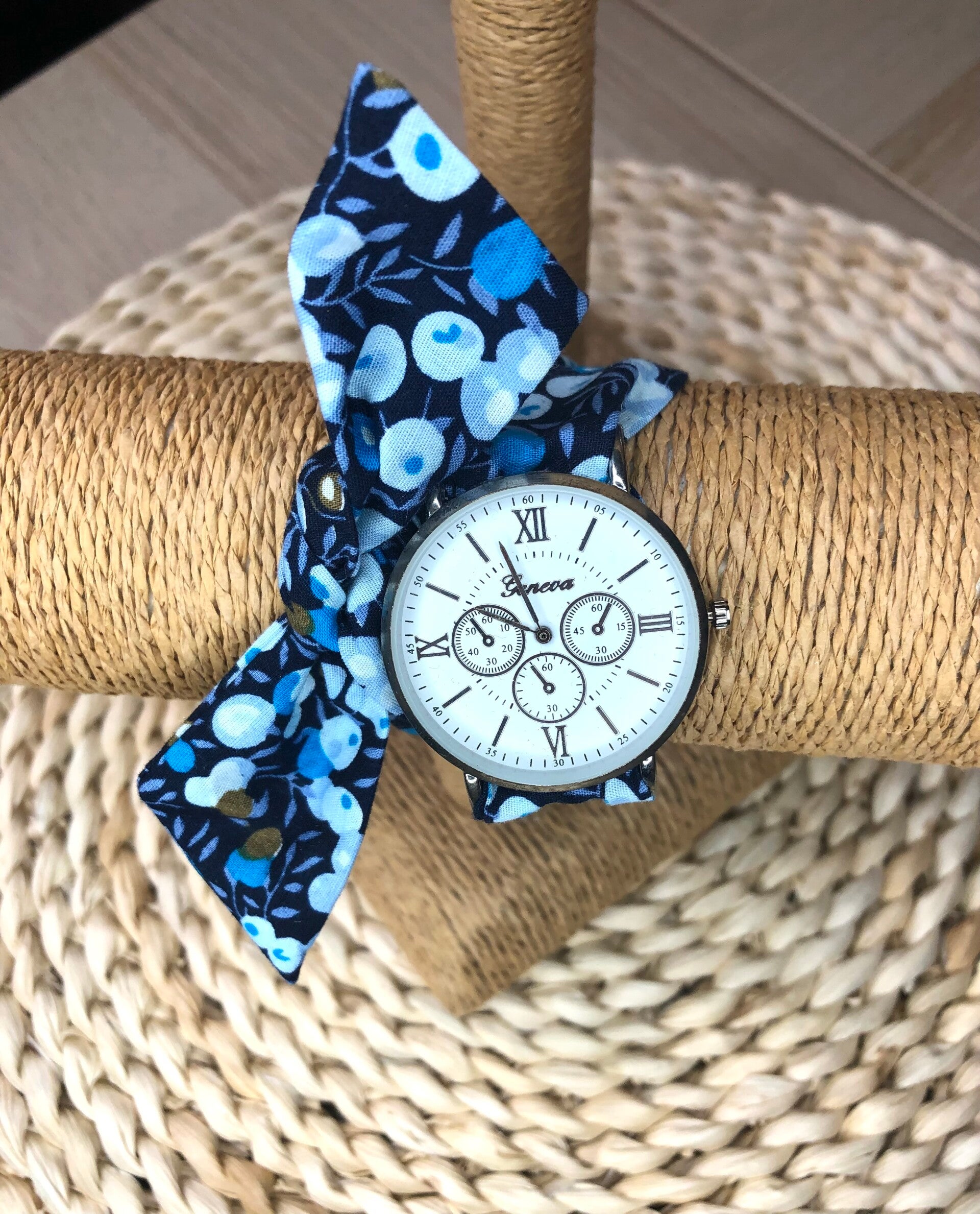 Montre à nouer avec bracelet personnalisable grâce aux nombreux tissus présents dans le catalogue.