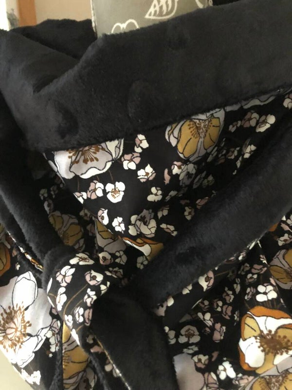 Chèche femme en coton à fleurs noir/gris/camel doublé polaire cœurs noir