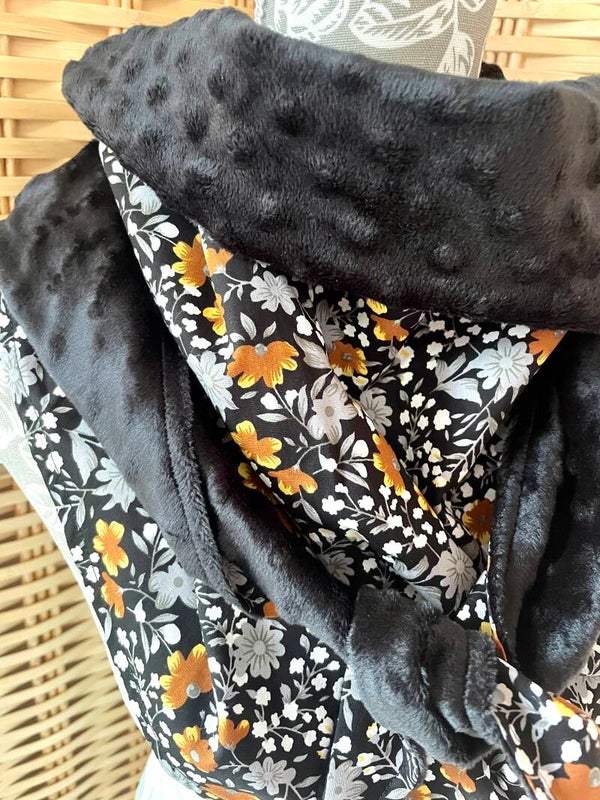 Chèche femme en coton fleuri noir/camel doublé polaire pois noir