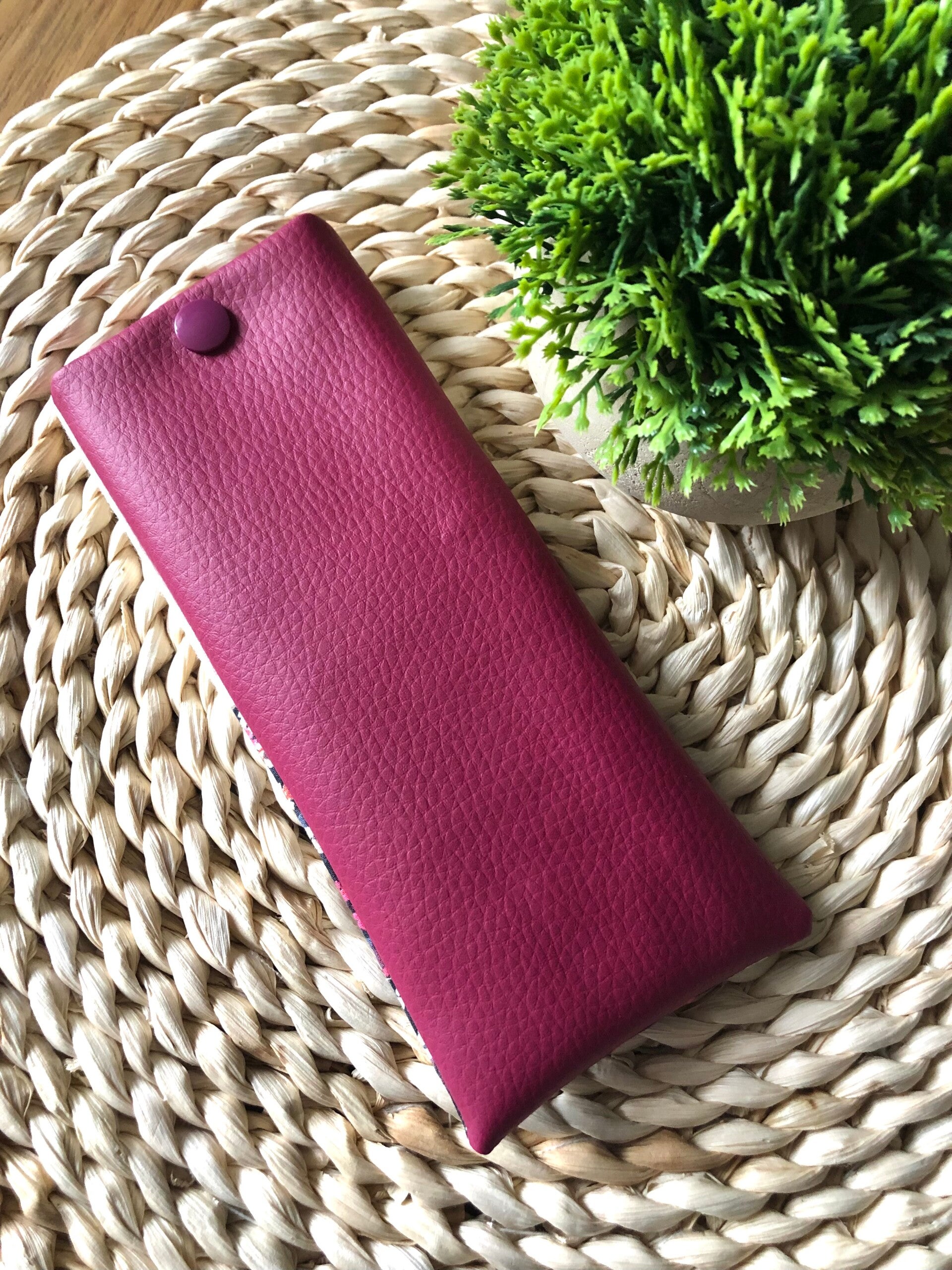 Etui à lunettes en coton doublé et verso simili cuir. il se ferme par un bouton pression en plastique.