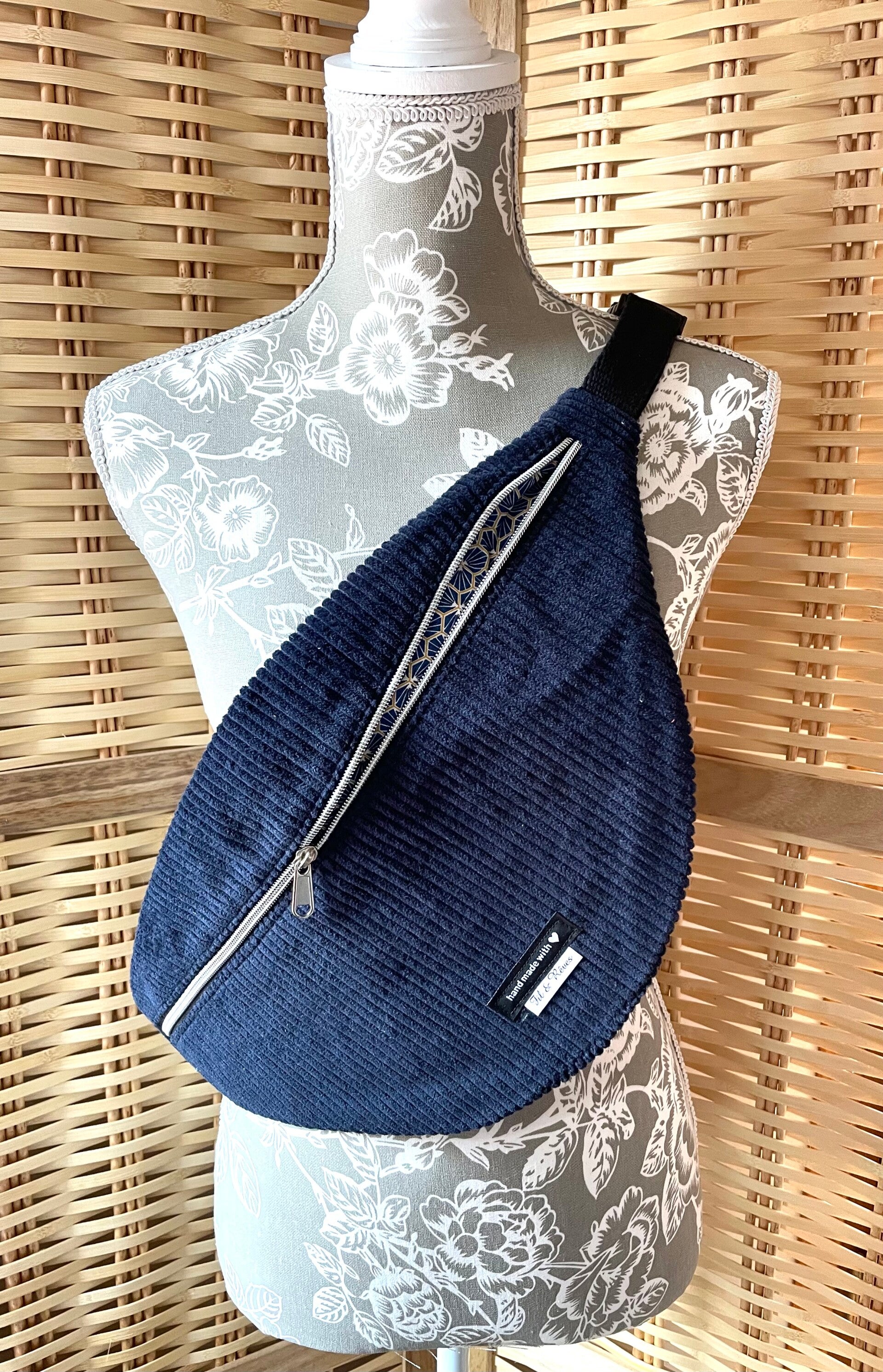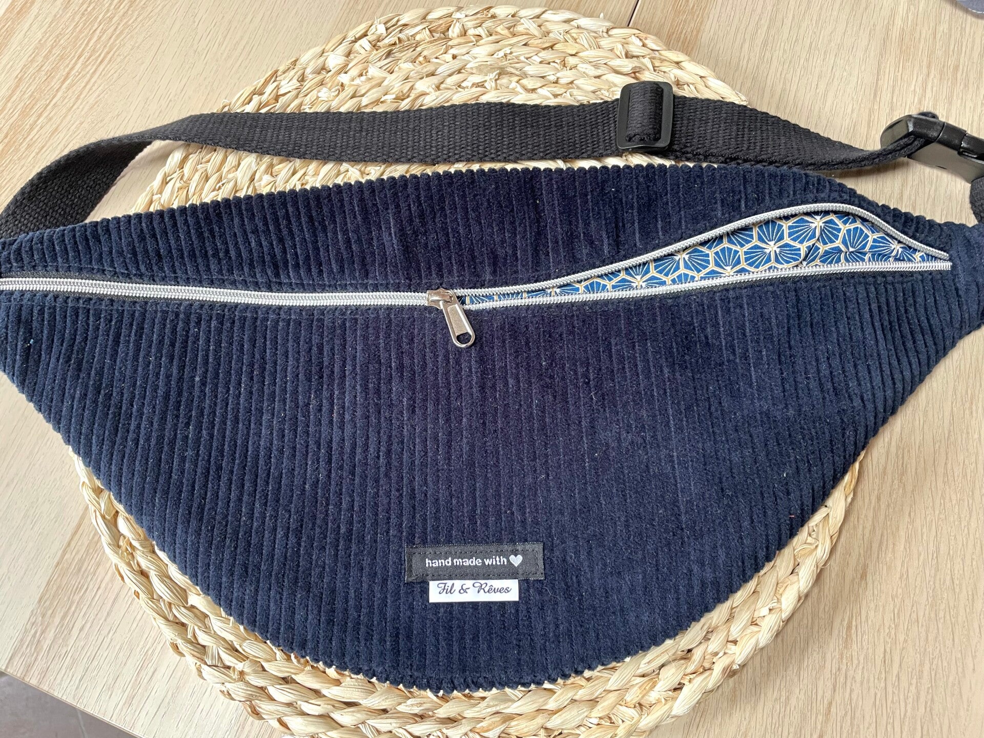 Cette banane XL a été cousu en velours côtelé avec une doublure 100% coton à motifs.