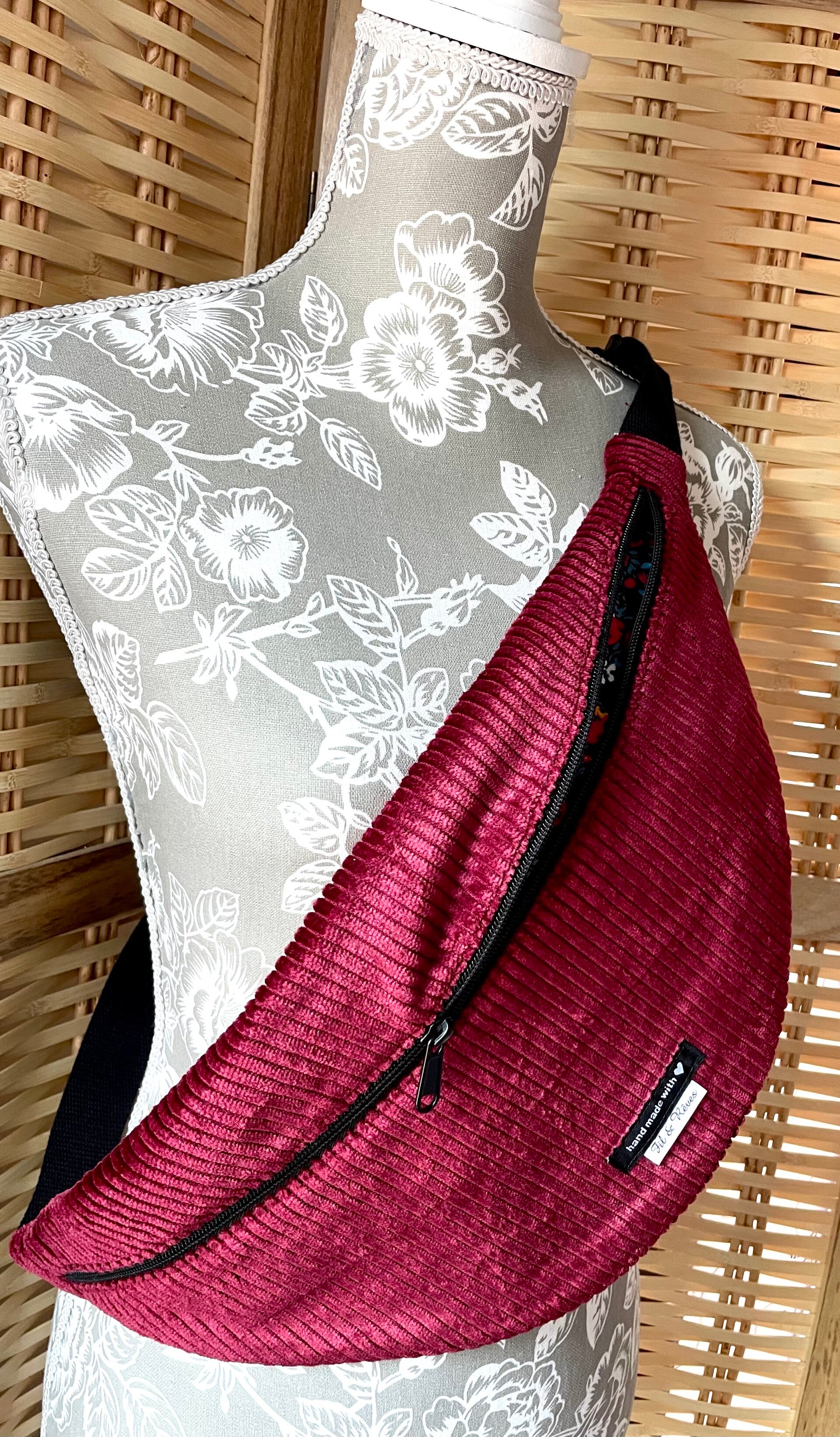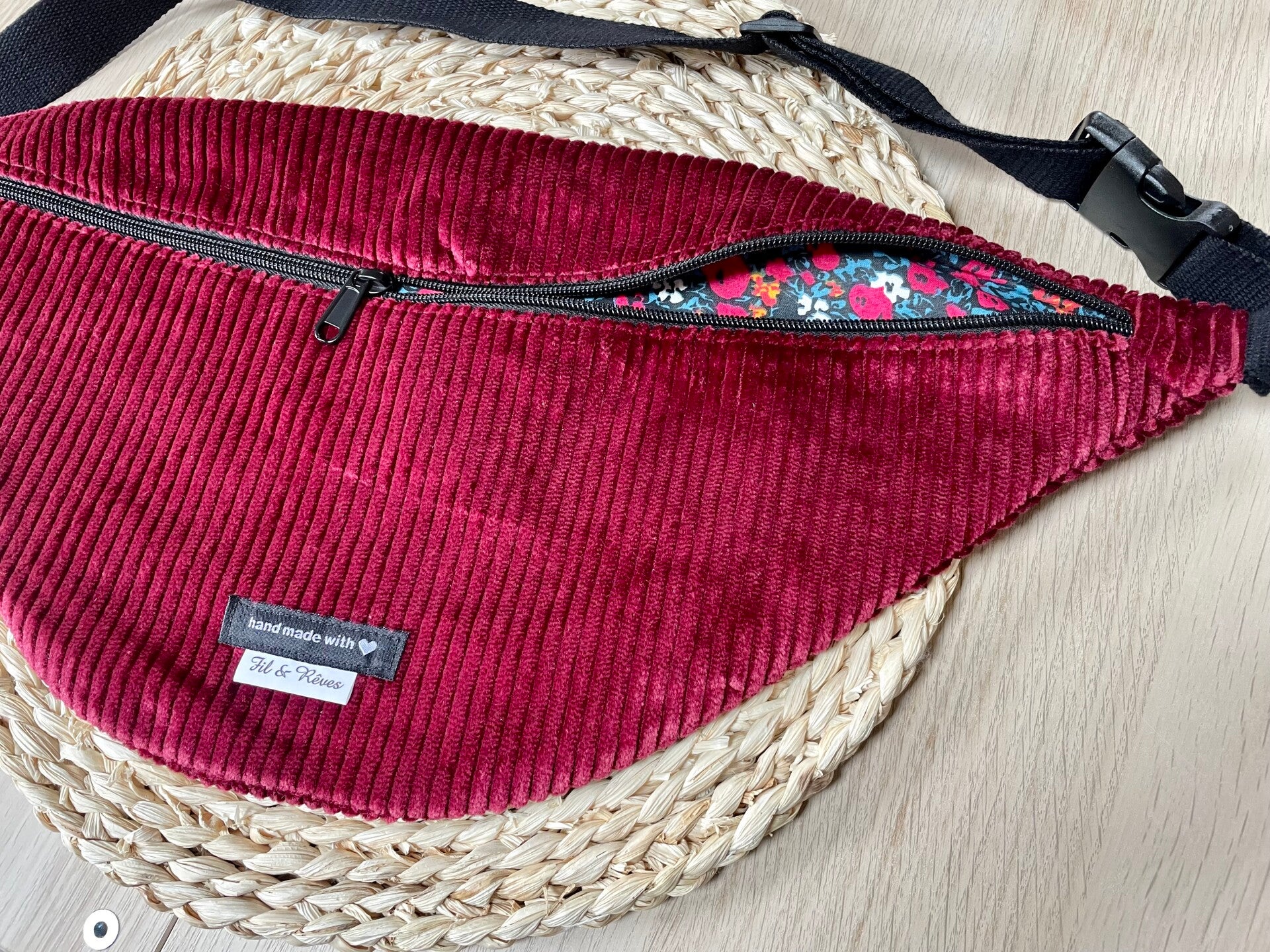 Cette banane XL a été cousu en velours côtelé avec une doublure 100% coton à motifs.