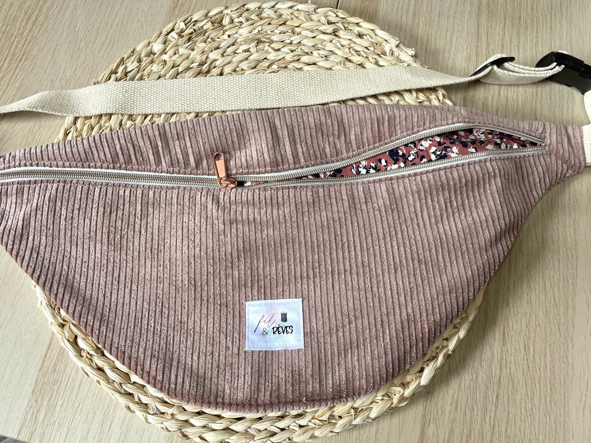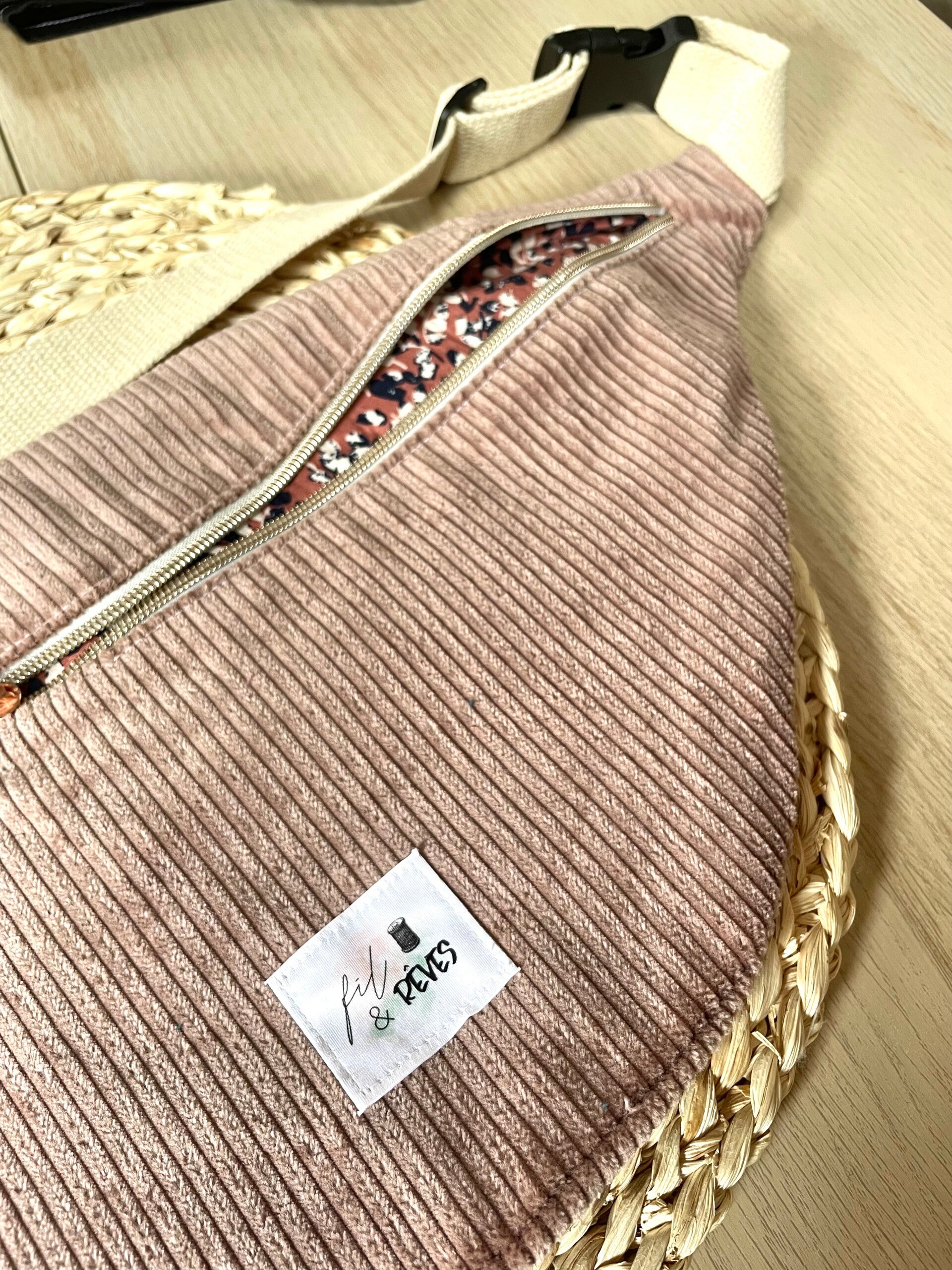 Cette banane XL a été cousu en velours côtelé avec une doublure 100% coton à motifs.