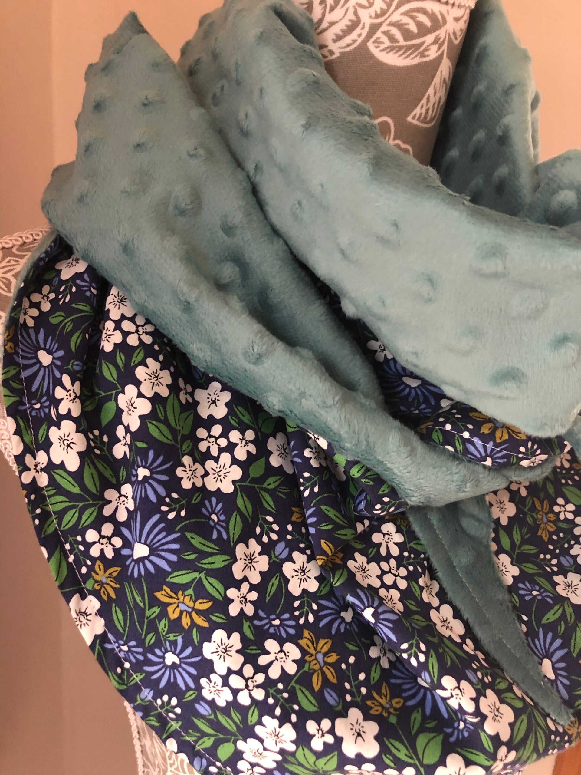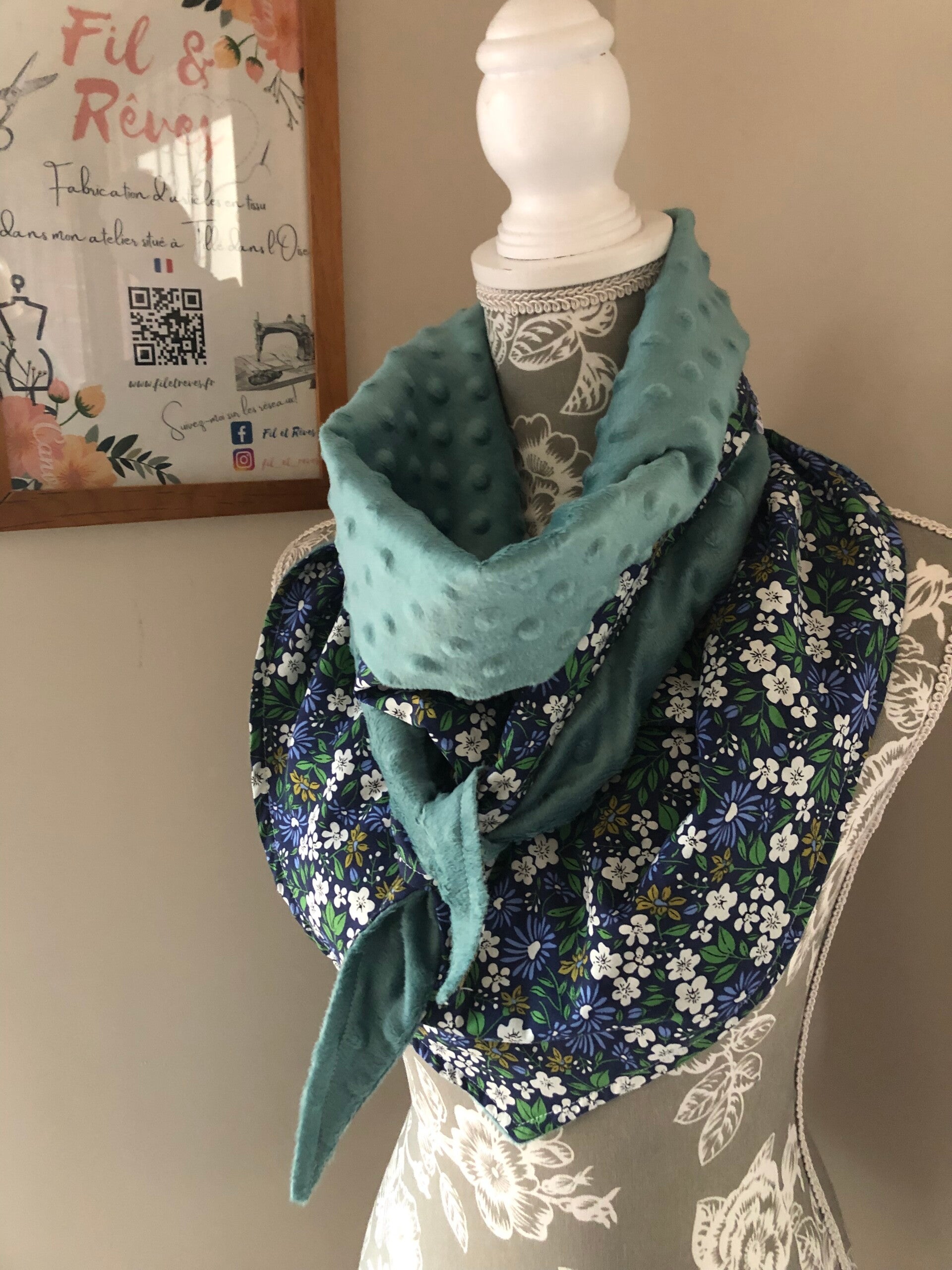 Chèche femme en coton petites fleurs bleu/vert/blanc doublé polaire pois menthe foncé