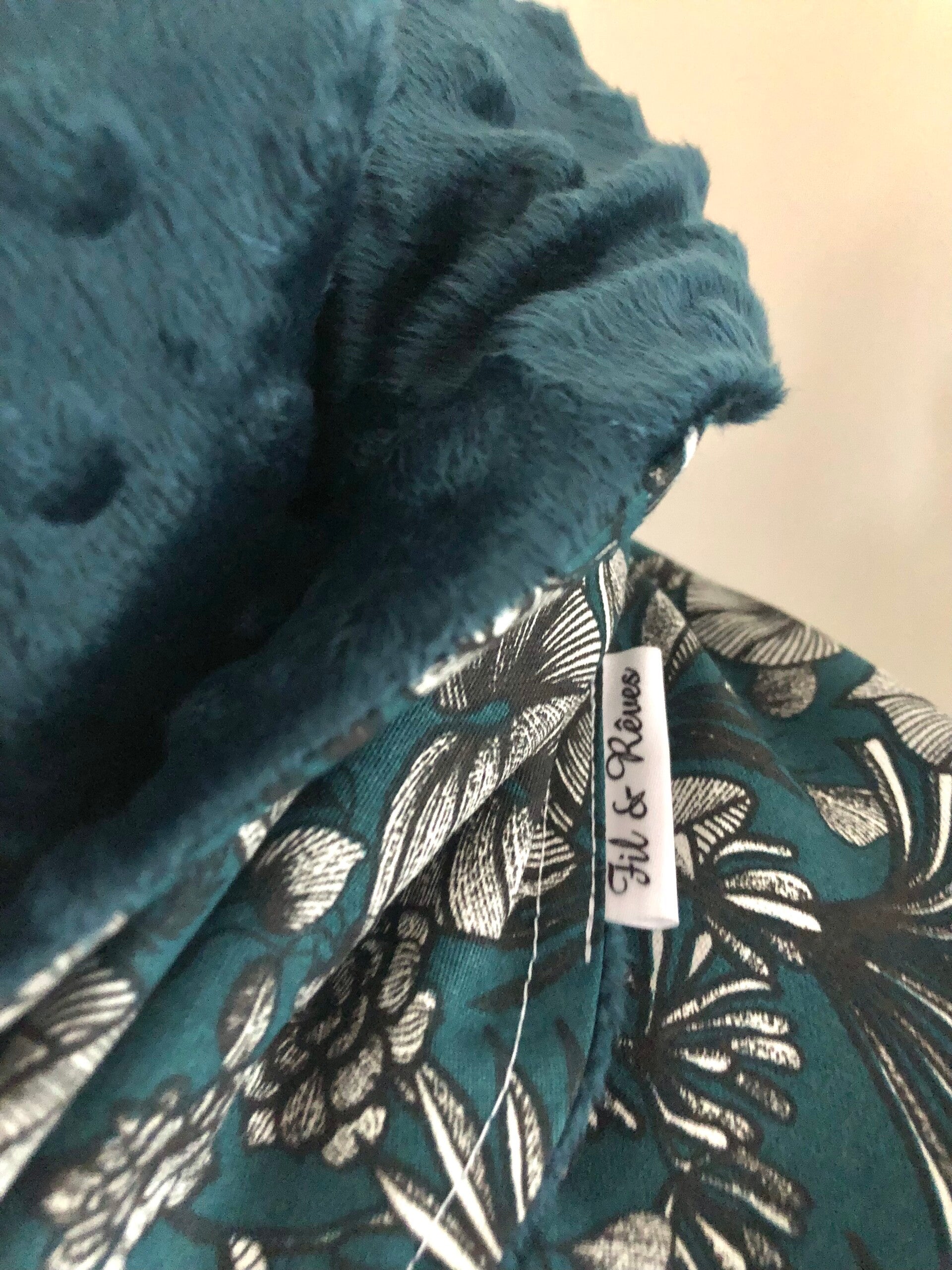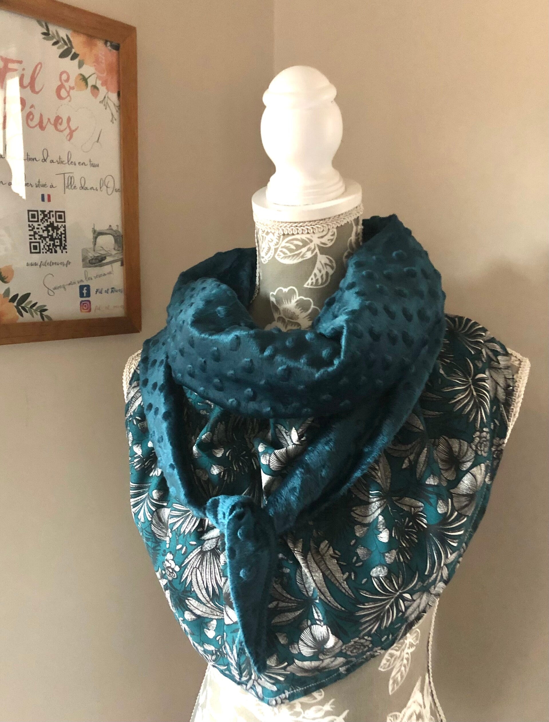 Chèche femme en coton à fleurs bleu pétrole doublé polaire bleu pétrole